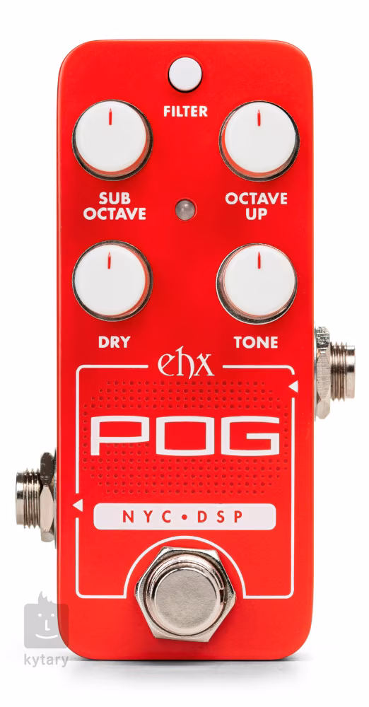 EXH Pico Pog je prozatím nejvýkonnější kompaktní polyfonní octaver z produkce EHX, který si vzal to nejlepší z Micro a Nano Pog krabiček a vměstnal je do malého kovového šasi. Nabízí oktávový efekt v nižší a vyšší oktávě se samostatnými ovladači hlasitosti, precizní tracking jednotlivých not i akordů, ovladač Dry pro nastavení poměru dry/wet signálu a ovladač Tone, který určuje frekvenční odezvu krabičky na základě zvoleného modu. Tlačítkem Filter totiž můžete přepínat mezi třemi režimy: Green - nabízí lineární odezvu (tilt EQ), Red - Low Pass Filter (LPF), kdy filtr propouští basy a ořezává výšky a Orange - High Pass Filter (HPF), kdy filtr naopak propouští výšky a ořezává basy.