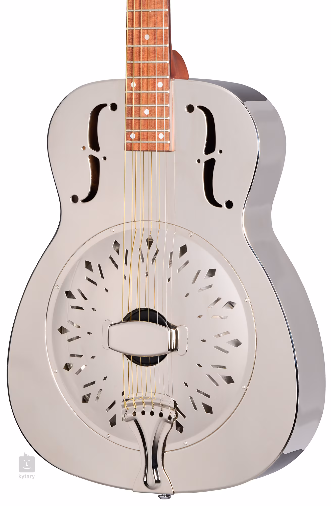 Akustický resonátor Epiphone Dobro Hound Dog M-14 Metal Body Nickel se stylem a zvukem amerických originálů jistě potěší hráče bluesu i bluegrassu. Nabízí poniklovaný mosazný korpus se dvěma F otvory a poniklovaný resonátor, které poskytují nástroji vřelý a znělý zvuk. K mahagonovému krku s 1960s SlimTaper "D" profilem je přilepen palisandrový hmatník osazený devatenácti pražci velikosti Medium. Orientaci po ploše hmatníku usnadňují poziční tečky z imitace perleti.