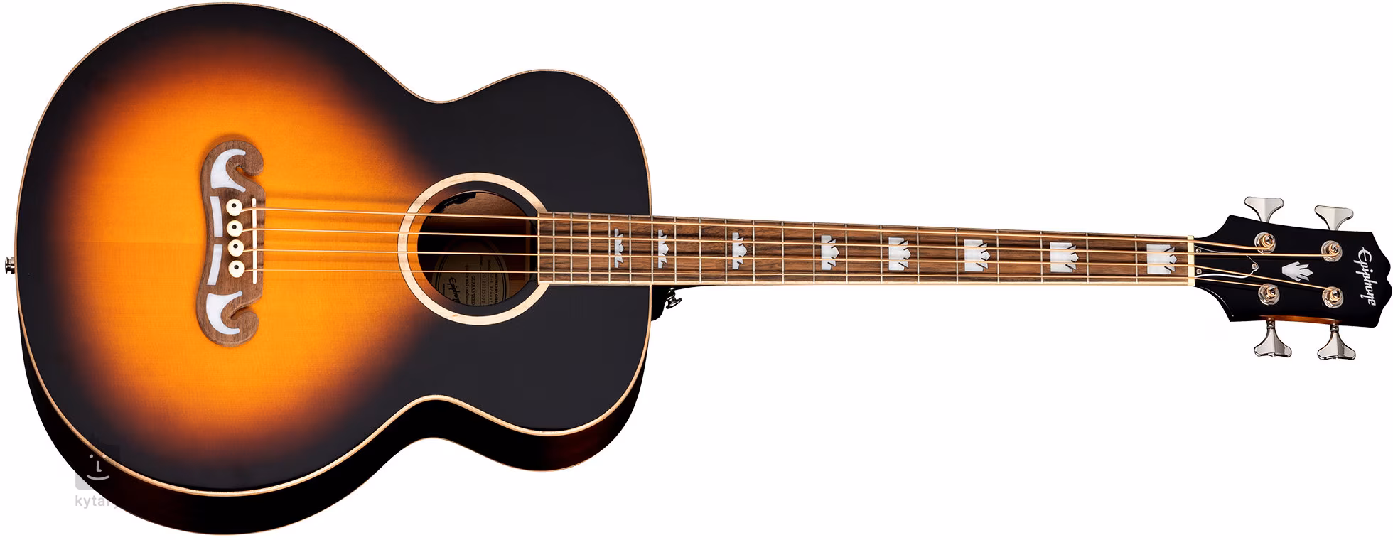 Elektroakustická baskytara El Capitan J-200 Studio Bass Aged Vintage Sunburst z dílen značky Epiphone poskytne akustickým tělesům i unplugged vystoupením rockových kapel potřebný basový spodek.