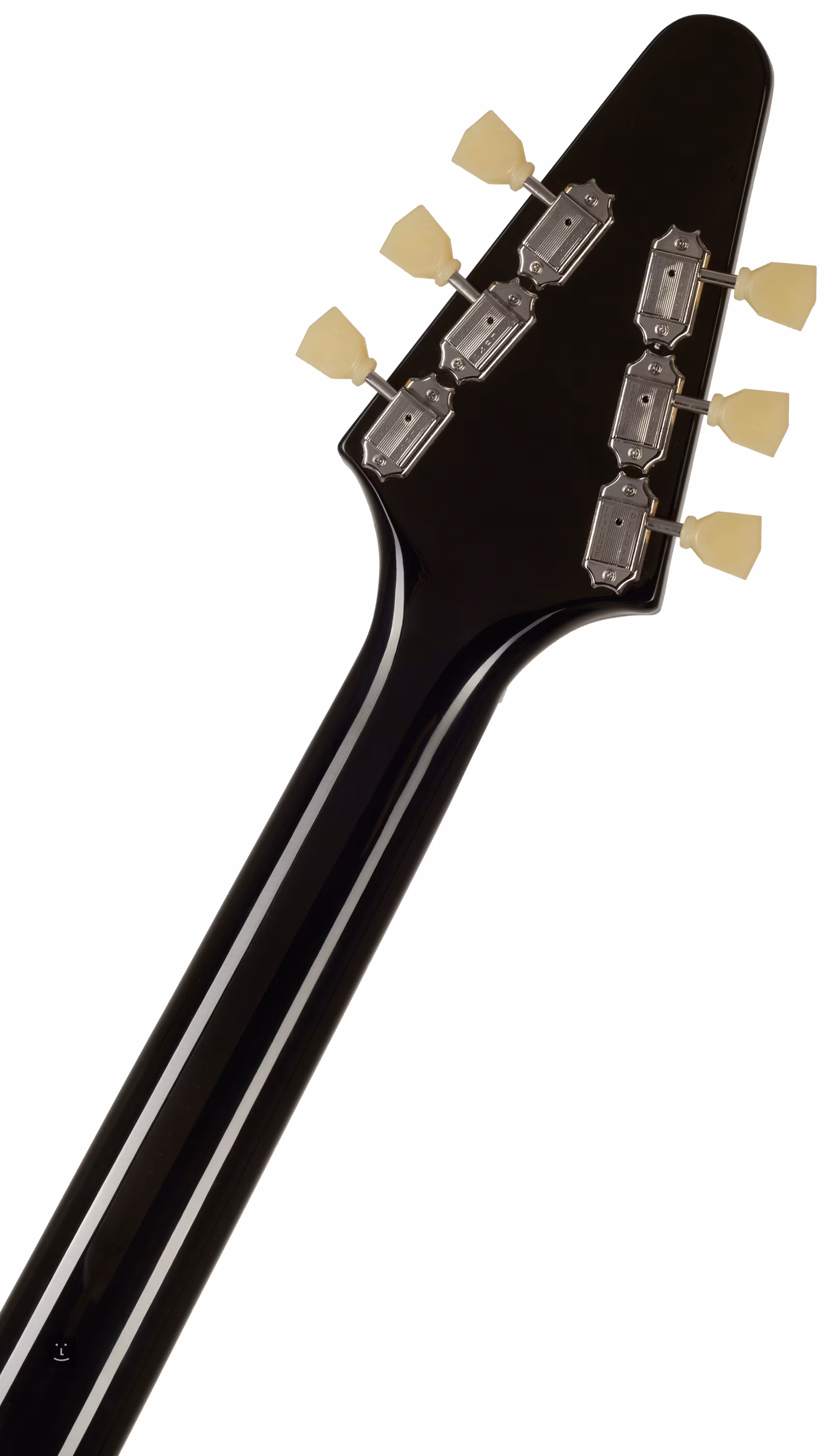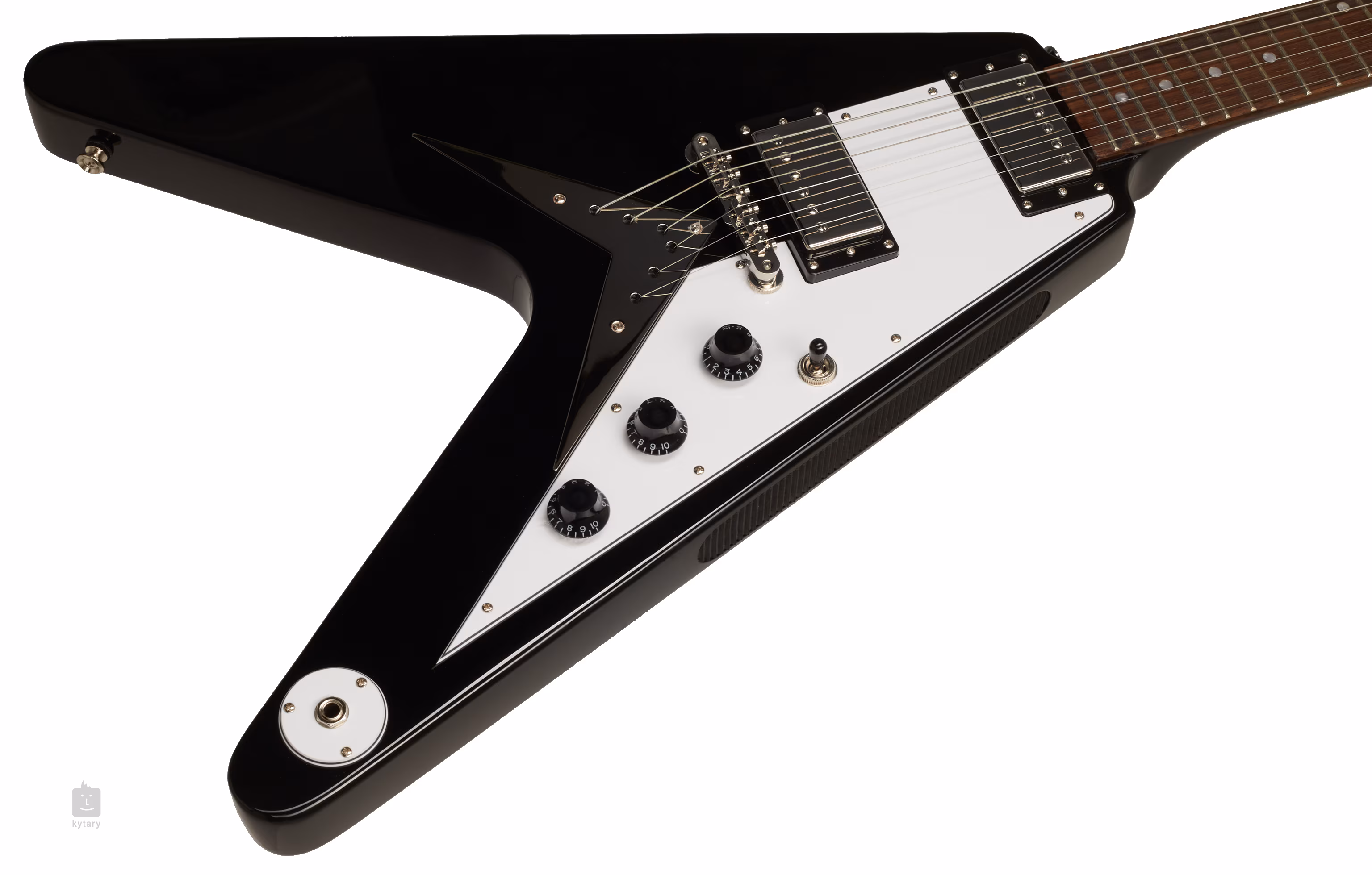 Elektrické kytary firmy Epiphone představují finančně dostupnější alternativu originálů s logem Gibson. Model Flying V Ebony ze série Inspired by Gibson se vrací k designu populárního „véčka“ z roku 1958.