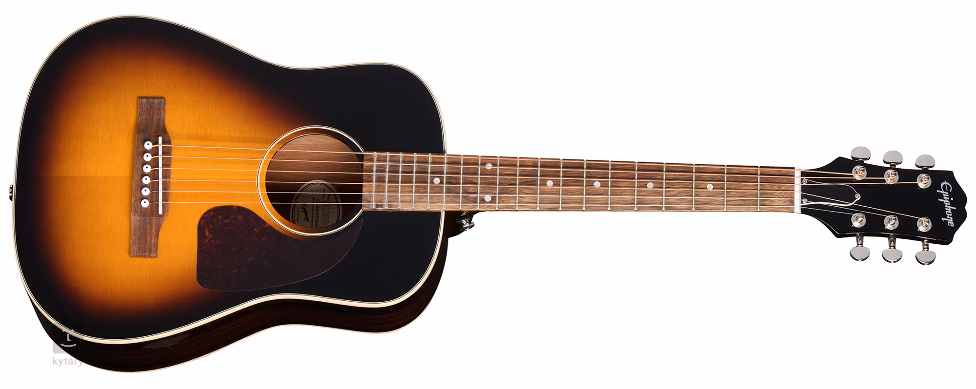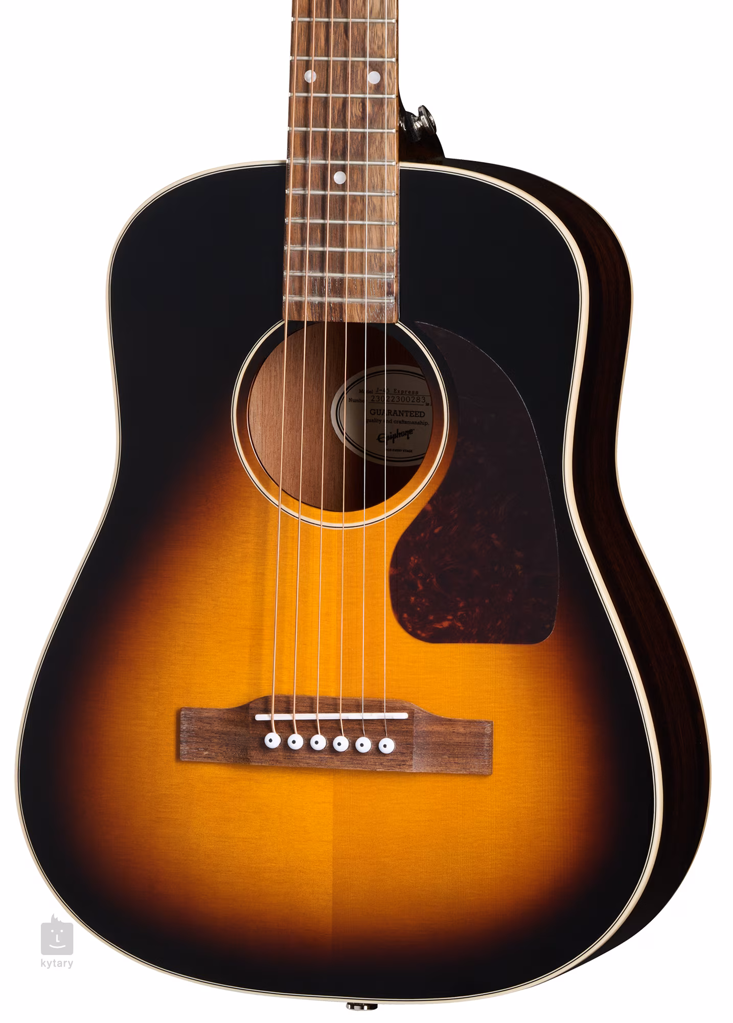 Epiphone J-45 Express Vintage Sunburst je zmenšený Gibson J-45 Slope Shoulder Dreadnought v 7/8 velikosti. Tato akustická kytara představuje ideální volbu pro mladé začínající hráče, ale i skvělého parťáka na letní toulky přírodou. Ostatně nástroj je dodáván v obalu (gig bag) spolu se třemi trsátky, takže stačí chytit nejbližší vlak a nic dalšího netřeba řešit.