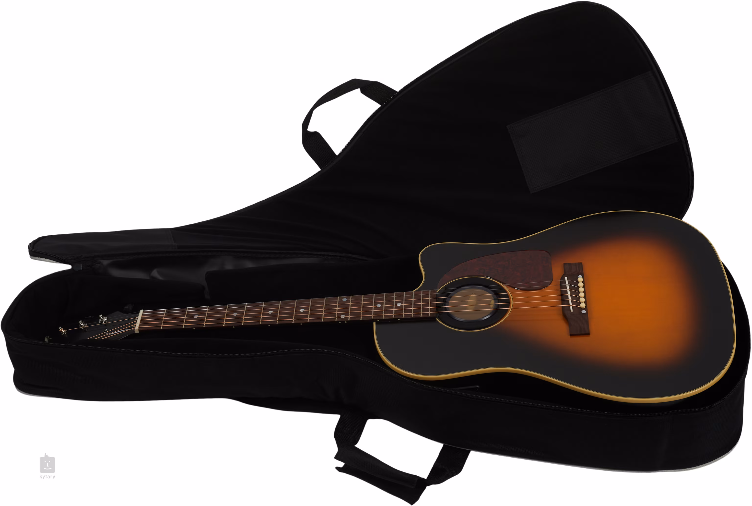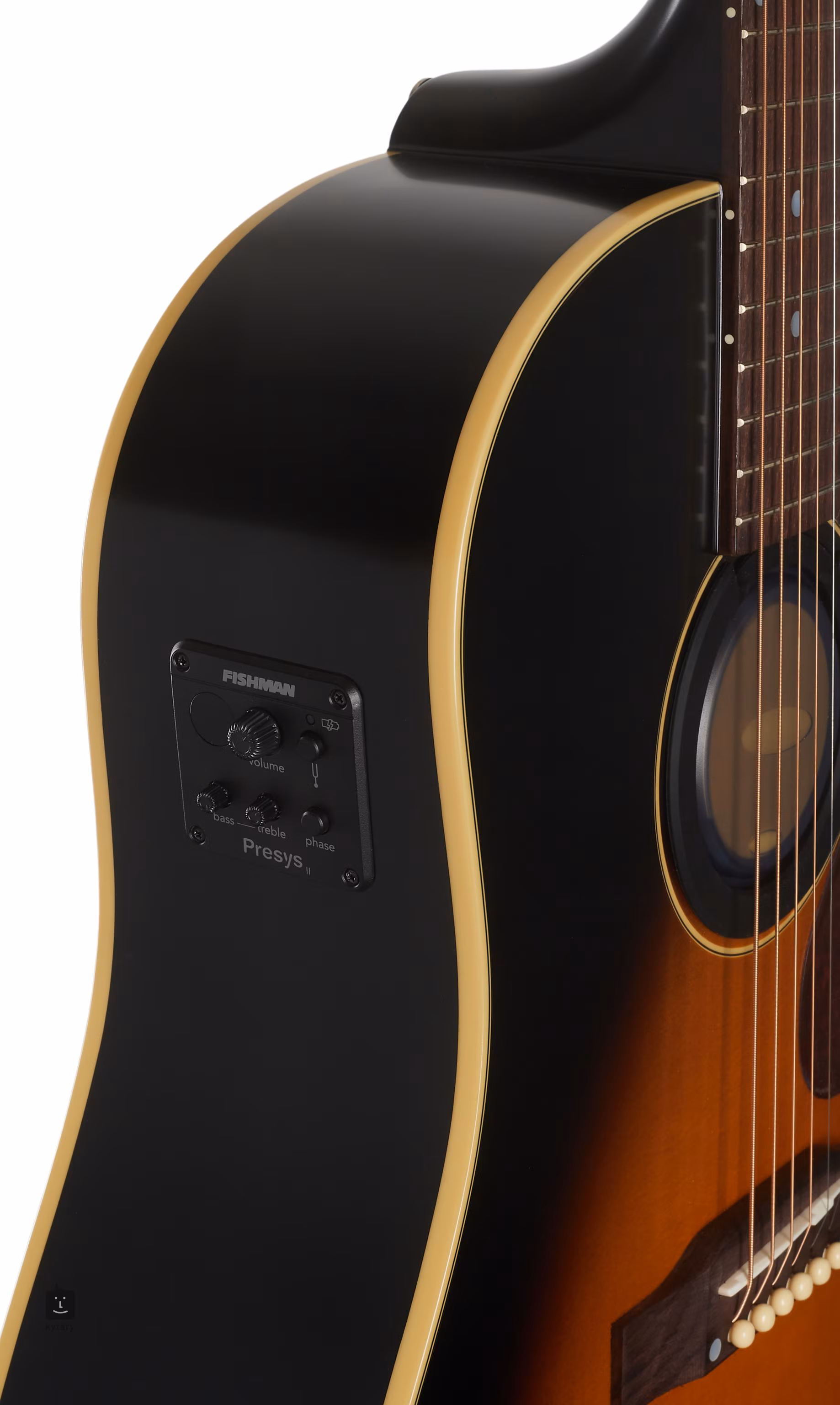 Elektroakustická kytara Epiphone J-45 Standard EC Vintage Sunburst z řady Inspired by Gibson Collection nabízí za dostupnější cenu vzhled, feel a zvuk Round Shoulder modelů Gibson J-45, tj. nejprodávanějších akustických kytar značky Gibson označovaných díky všestrannému využití a střídmému designu jako “workhorse”.