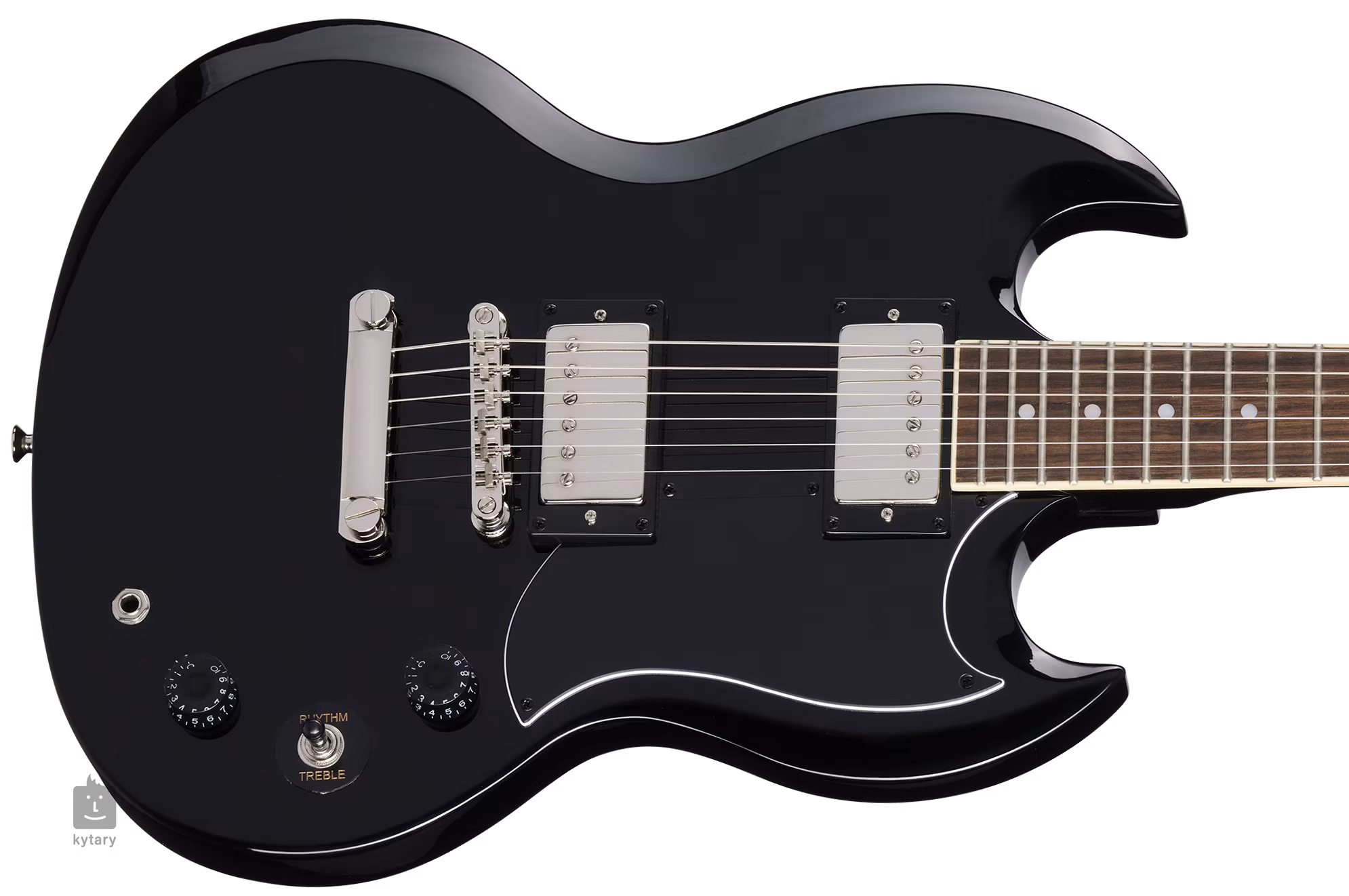 Dva firemní humbuckery s keramickými magnety poskytují kytaře plný šťavnatý zvuk, který oceníte v rocku a dalších hudebních žánrech. Kontury zvuku upravíte pomocí standardních ovladačů. Struny jsou uchyceny ve firemních die-cast mechanikách s převodovým poměrem 15:1 a přes kobylku LockTone TOM ve struníku. Stylový design podtrhuje černý pickguard a niklový hardware.