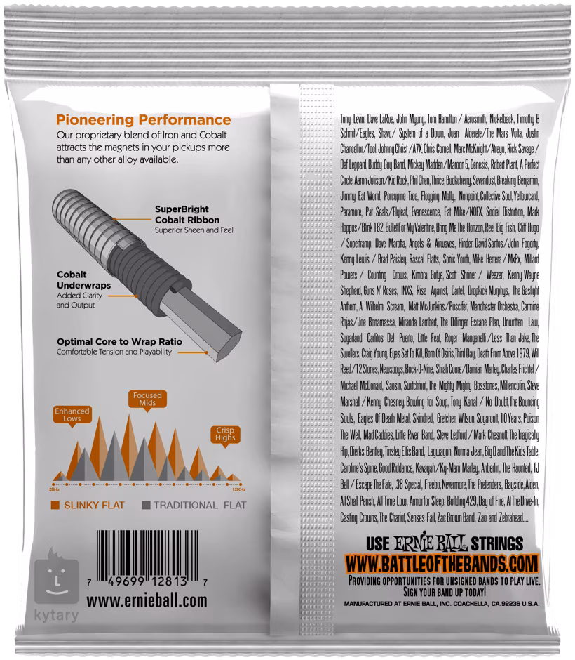 Americká firma Ernie Ball patří již řadu desetiletí mezi přední výrobce kytarových a baskytarových strun. Pro jejich výrobu používá ty nejmodernější technologie a kvalitní materiály. Reaguje tak na současné požadavky a nároky i těch nejnáročnějších muzikantů. Jejich unikátní zvuk je zachycen na nahrávkách osobností jako Paul McCartney, Tony Levin, Mark Hoppus, Mike Herrera, Johnny Christ, Dave La Rue, John Myung nebo Juan Alderete. Struny jsou vyráběny ve Spojených státech amerických.