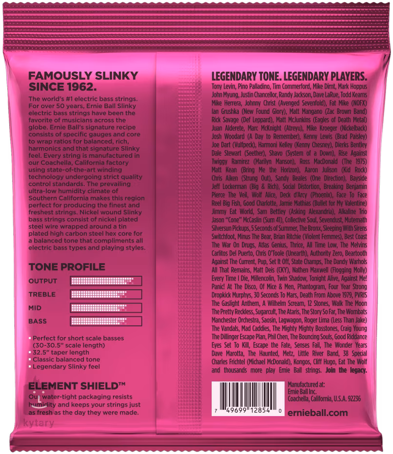 Struny pro elektrické baskytary značky Ernie Ball z řady Slinky Nickel Wound jsou mezi strunami této značky naprostým bestsellerem. Vynikají zejména kvalitou použitých materiálů, precizním zpracováním a zvukovou všestranností, díky níž se uplatní v téměř jakémkoliv hudebním žánru. Jejich základem je šestihranné ocelové jádro a válcové vinutí z poniklované oceli. Výsledkem je frekvenčně vyvážený tón, který se uplatní v rockové, metalové, popové i bluesové hudbě.