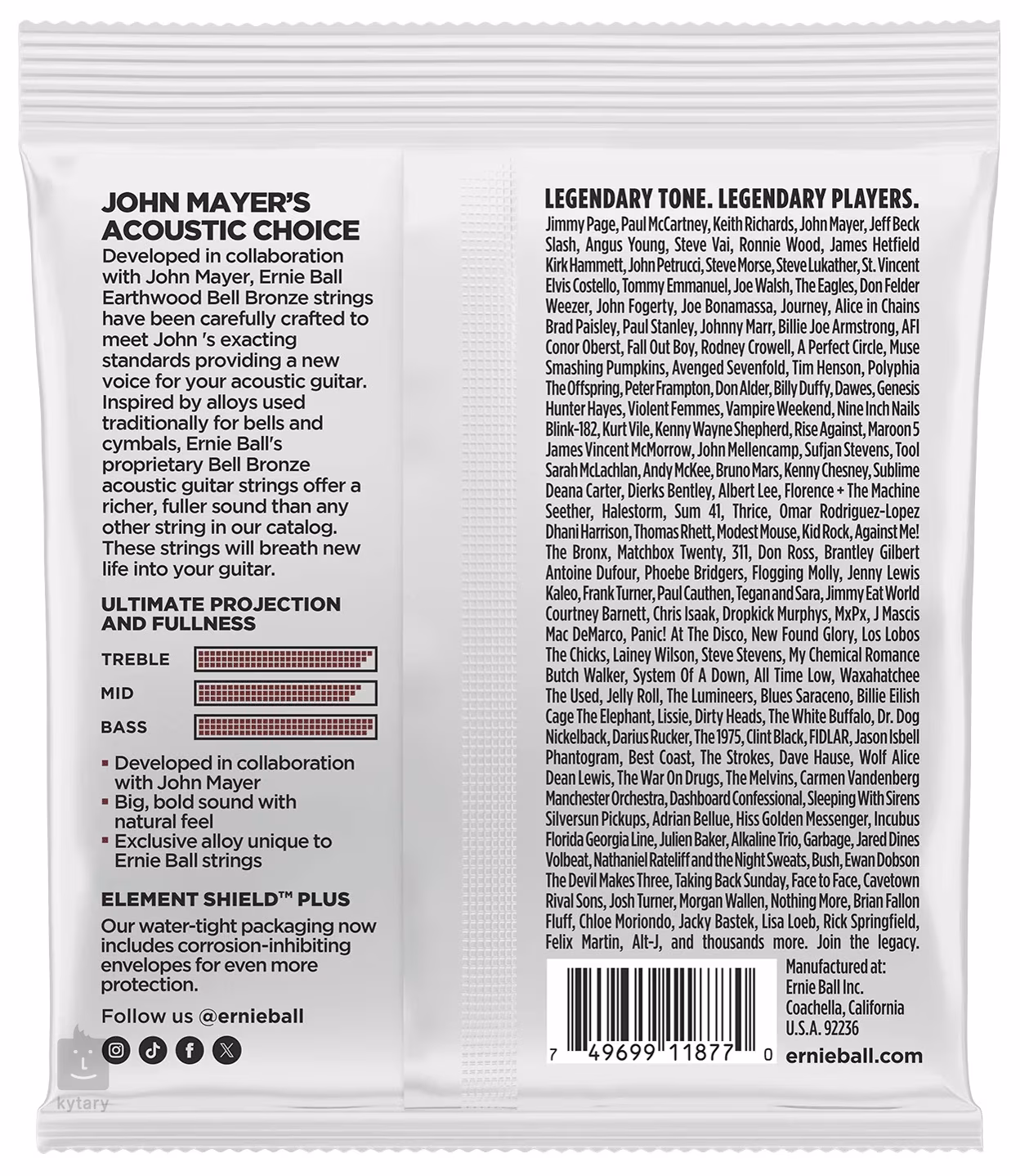 Struny pro akustickou kytaru Earthwood Bell Bronze jsou výsledkem dlouholeté spolupráce mezi společností Ernie Ball a kytaristou Johnem Mayerem, jehož unikátní styl hry ovlivnil celou generaci muzikantů. Tato sada byla vyladěna tak, aby splňovala Mayerovy náročné požadavky a využívá materiály, které u žádných jiných strun nenajdete. Struny jsou vinuté bronzovou slitinou, která se tradičně používá pro výrobu zvonů a činelů, což jim dodává jasný, rezonující tón, jenž vaší kytaře vdechne nový život. Dopřejte sobě a své kytaře to nejlepší se strunami Earthwood Bell Bronze.