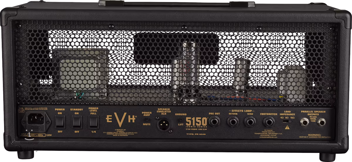 Zadní panel je opatřen konektory Send a Return pro integraci efektové smyčky, paralelními výstupy pro reproduktory s impedancí 4, 8 nebo 16 Ω a DI výstupem s emulací reproduktorů, který vám umožní dosáhnout věrného lampového EVH tónu i při přímém nahrávání do DAW nebo propojení s PA systémem. Dále je k dispozici vstup pro externí footswitch (dvoutlačítkový footswitch je součástí balení) a výstup Pre Out, s jehož pomocí můžete poslat signál z preampu do externího koncového zesilovače. Dále nechybí praktický atenuátor výkonu, který vám umožní snížit výkon zesilovače na ¼ a zachovat jeho plný lampový tón i při nižších hlasitostech.