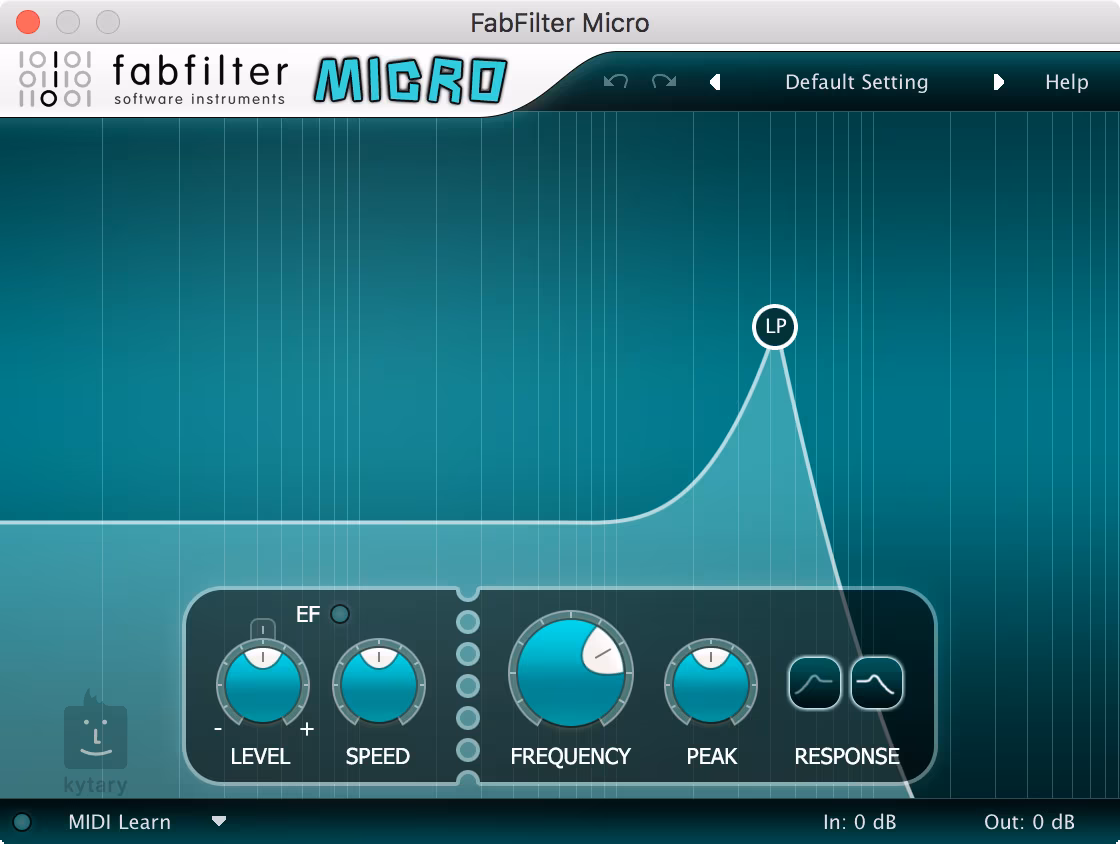 Jediný filtr FabFilter Micro je hladký a krémový, ale při úpravě pomocí interaktivního displeje se snadno promění v syrově znějící zvuk se samovolnou oscilací. Filtr je vybaven nastavením low-pass a hi-pass, envelope follower a modulací cut-off frekvence. Pomocí jednotlivých parametrů Input Gain a Output Gain můžete plně ovládat saturaci vnitřního filtru, takže FabFilter Micro se ideálně hodí nejen pro základní filtrační úlohy, ale je také schopen krásných efektů zkreslení a analogové saturace.