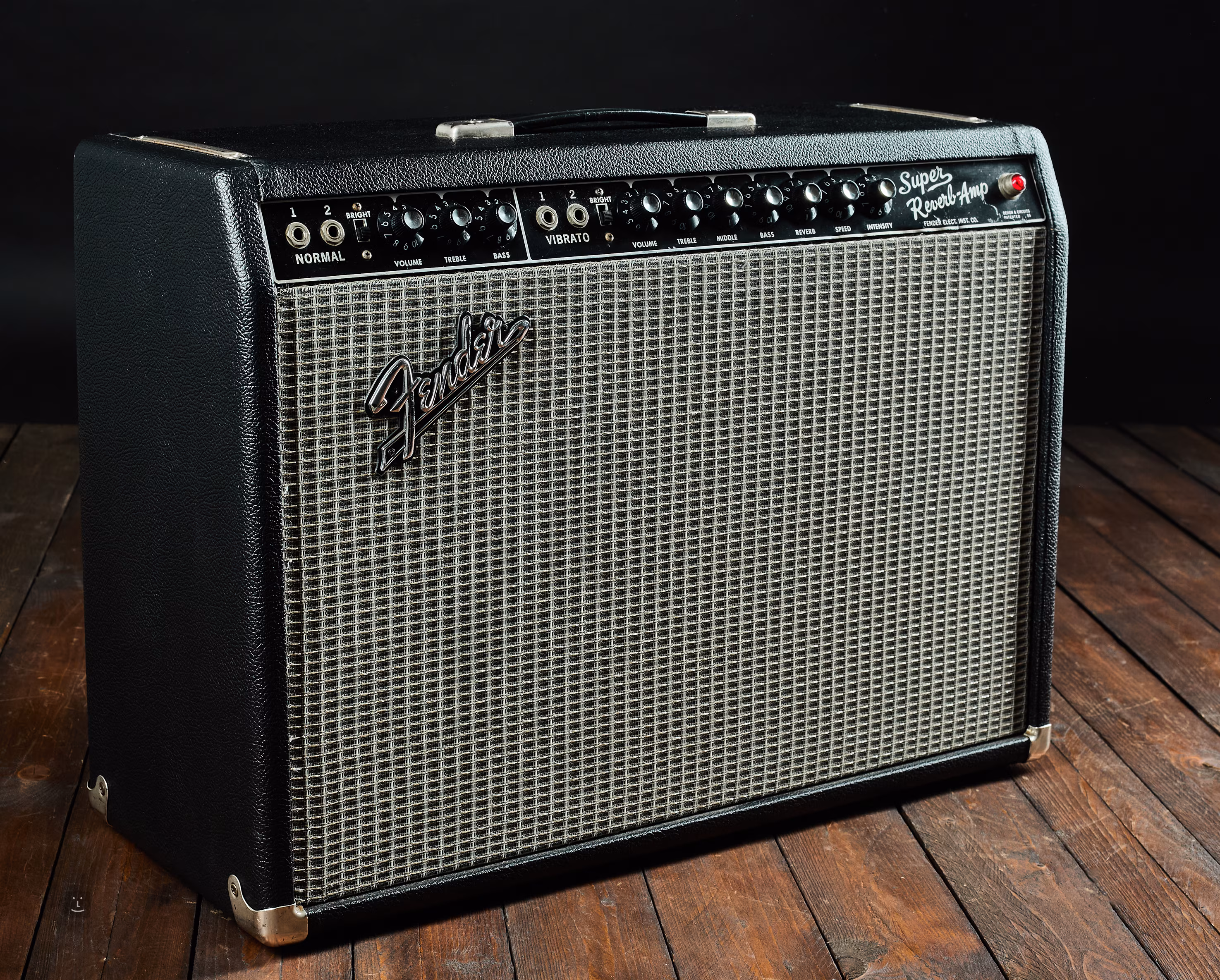 Fender Super Reverb AB763 je pravověrný vintage aparát z roku 1965 - "Black Face", výrobní éra pre-CBS. Kombo má upravený kabinet na 2 reproduktory (původní verze měla 4).