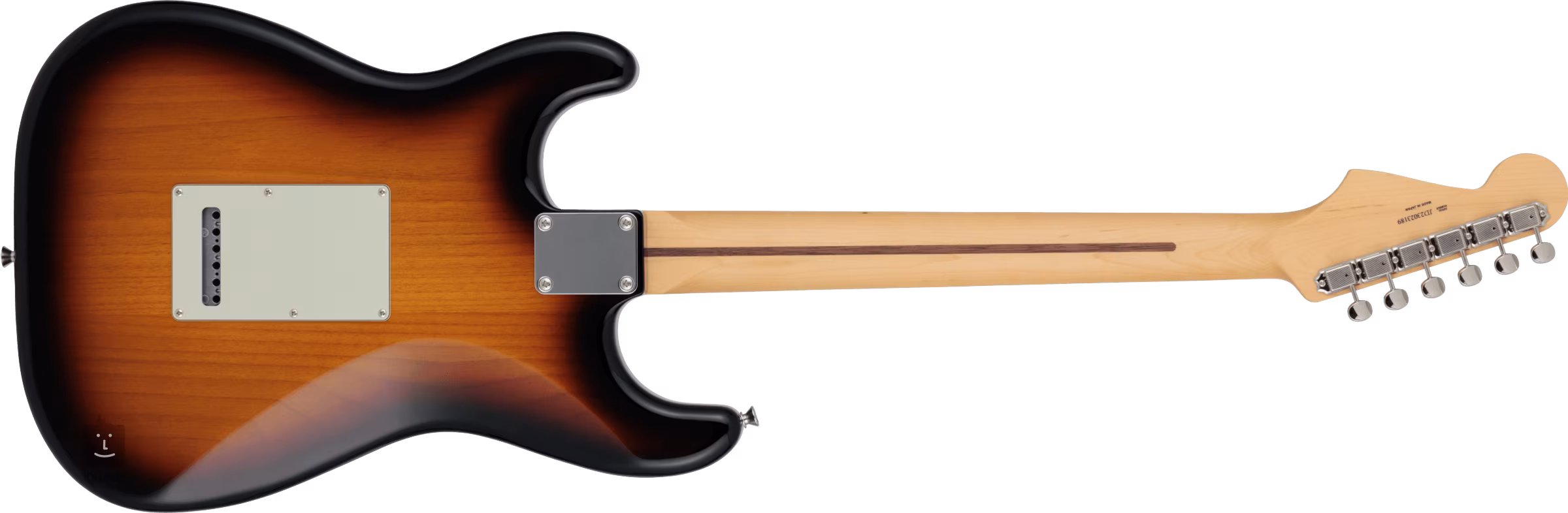 Tělo elektrické kytary 2024 Collection Made in Japan Hybrid II Stratocaster HSS 3-Color Sunburst je zhotoveno z olše. K javorovému krku s pohodlným “Modern C” profilem je přilepen palisandrový hmatník osazený dvaadvaceti pražci velikosti Narrow Tall. Orientaci na hmatníku usnadňují bílé poziční tečky.