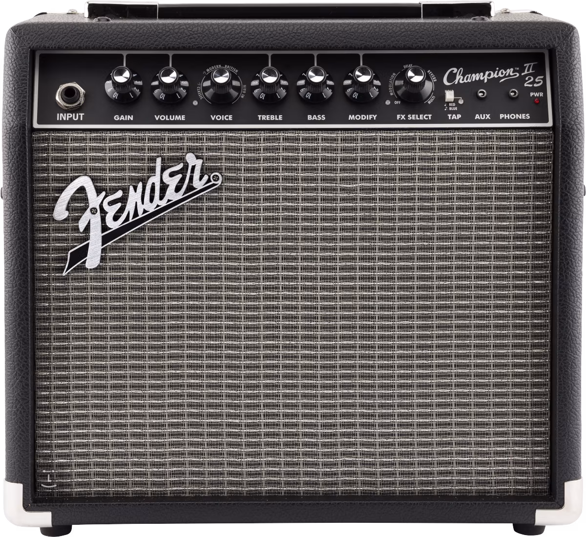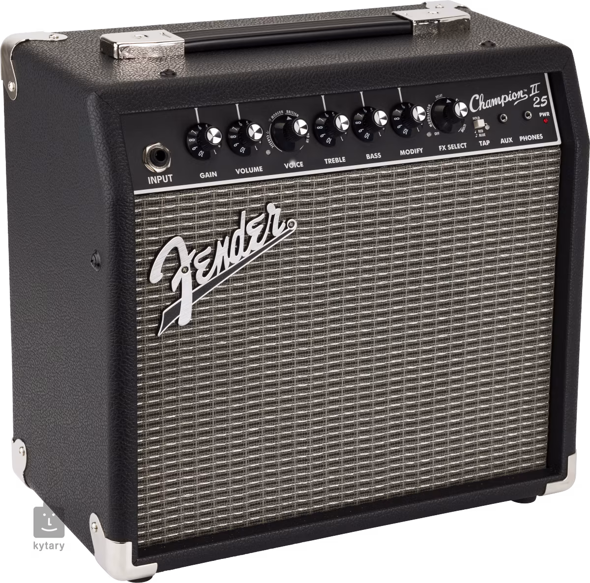 Kytarové tranzistorové kombo Fender CHAMPION II 25 představuje ideální volbu aparátu na cvičení nebo zkoušení s kapelou pro začínající kytaristky a kytaristy. Jedná se o jednokanálové kombo s výkonem 25W a volitelným nastavením zvuku/voicingem, které vám nabídne jak čisté tóny, tak i rockovější overdrive a metalové distortion zkreslení. Jednoduše od jazzu, country a blues po rock a metal.