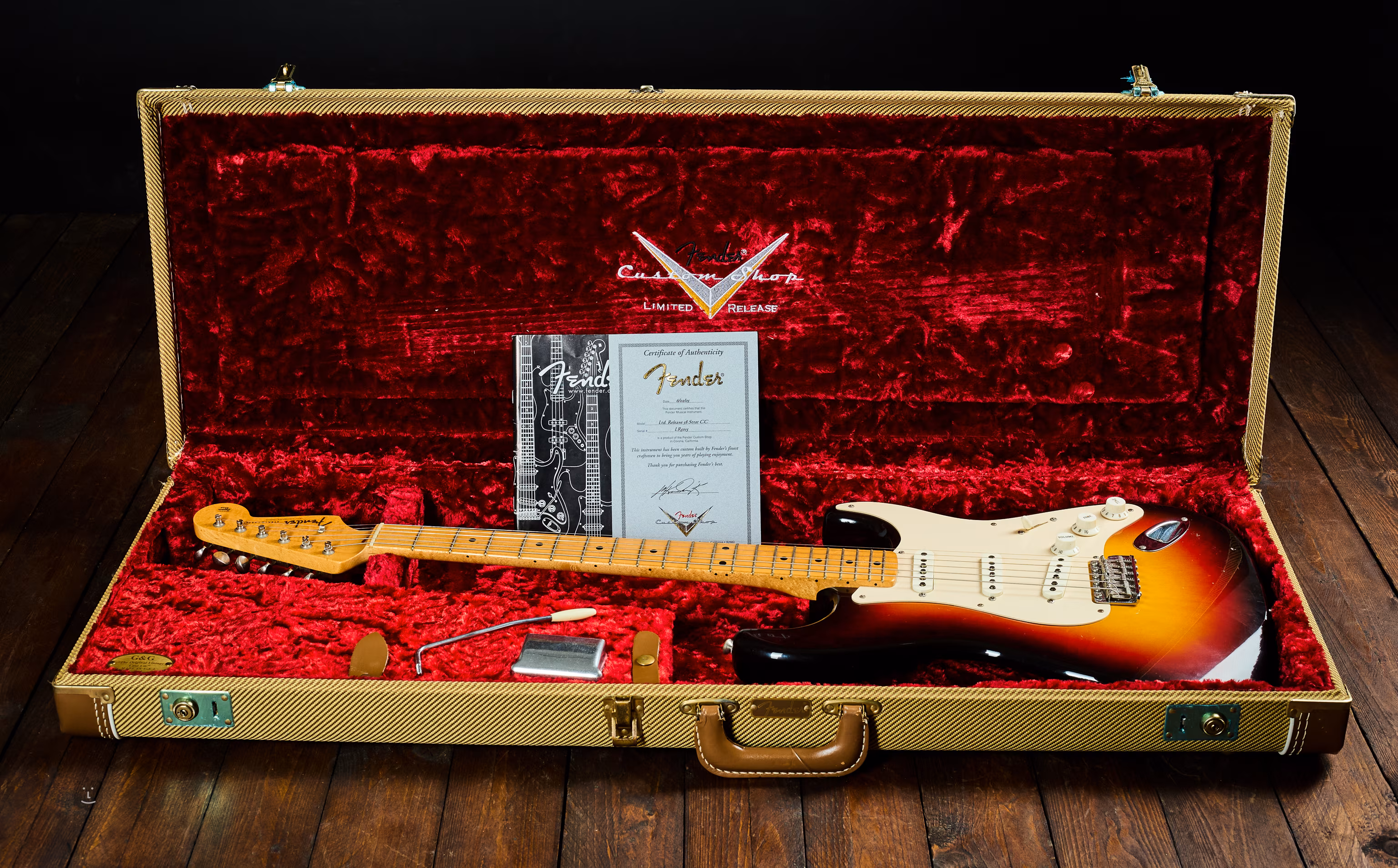Jde o použité zboží ve smyslu DPH, bazarový režim. Součástí prodeje je původní tweedový kufr, páka, kryt kobylky a certifikát Fender CS.
