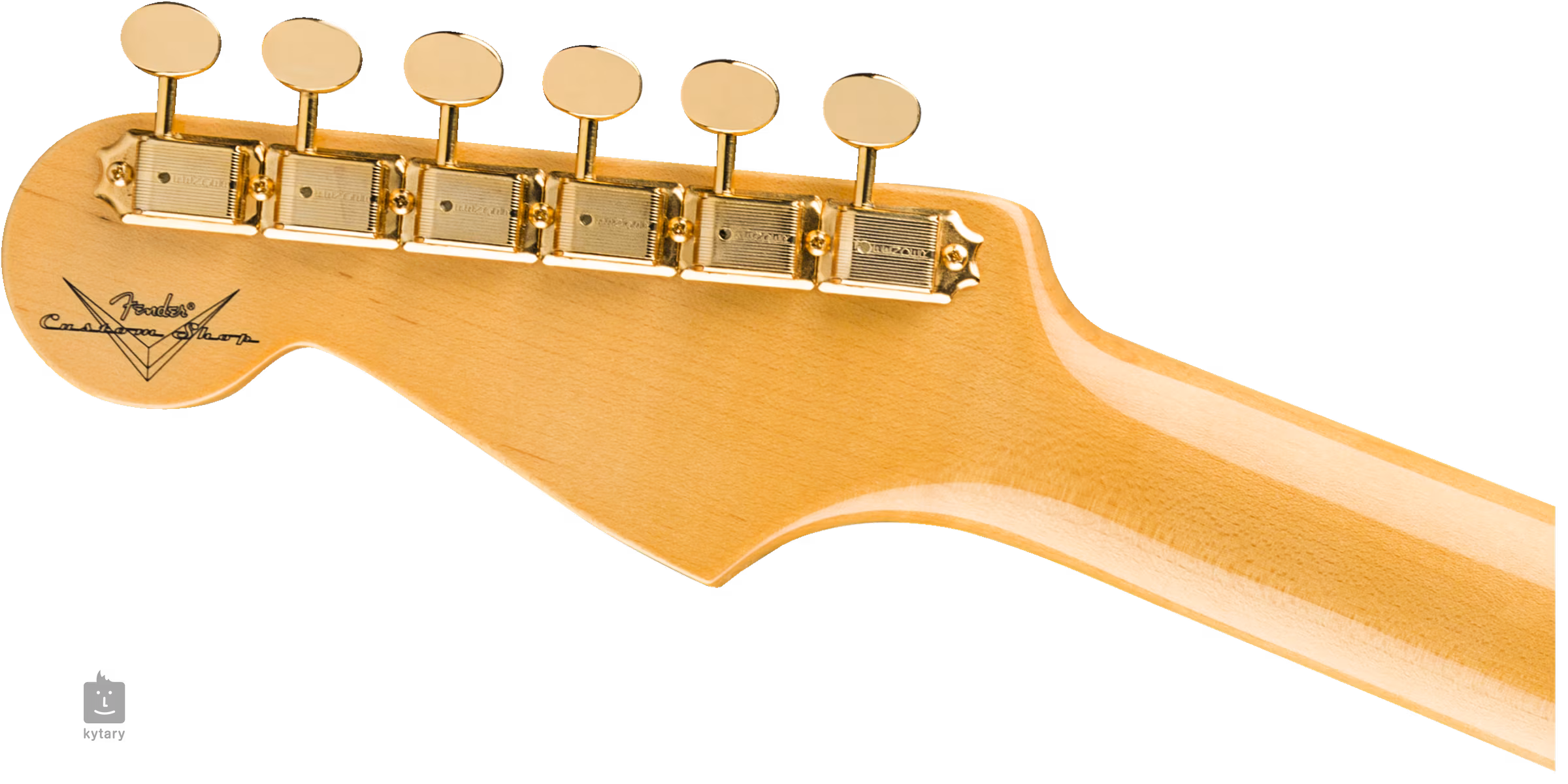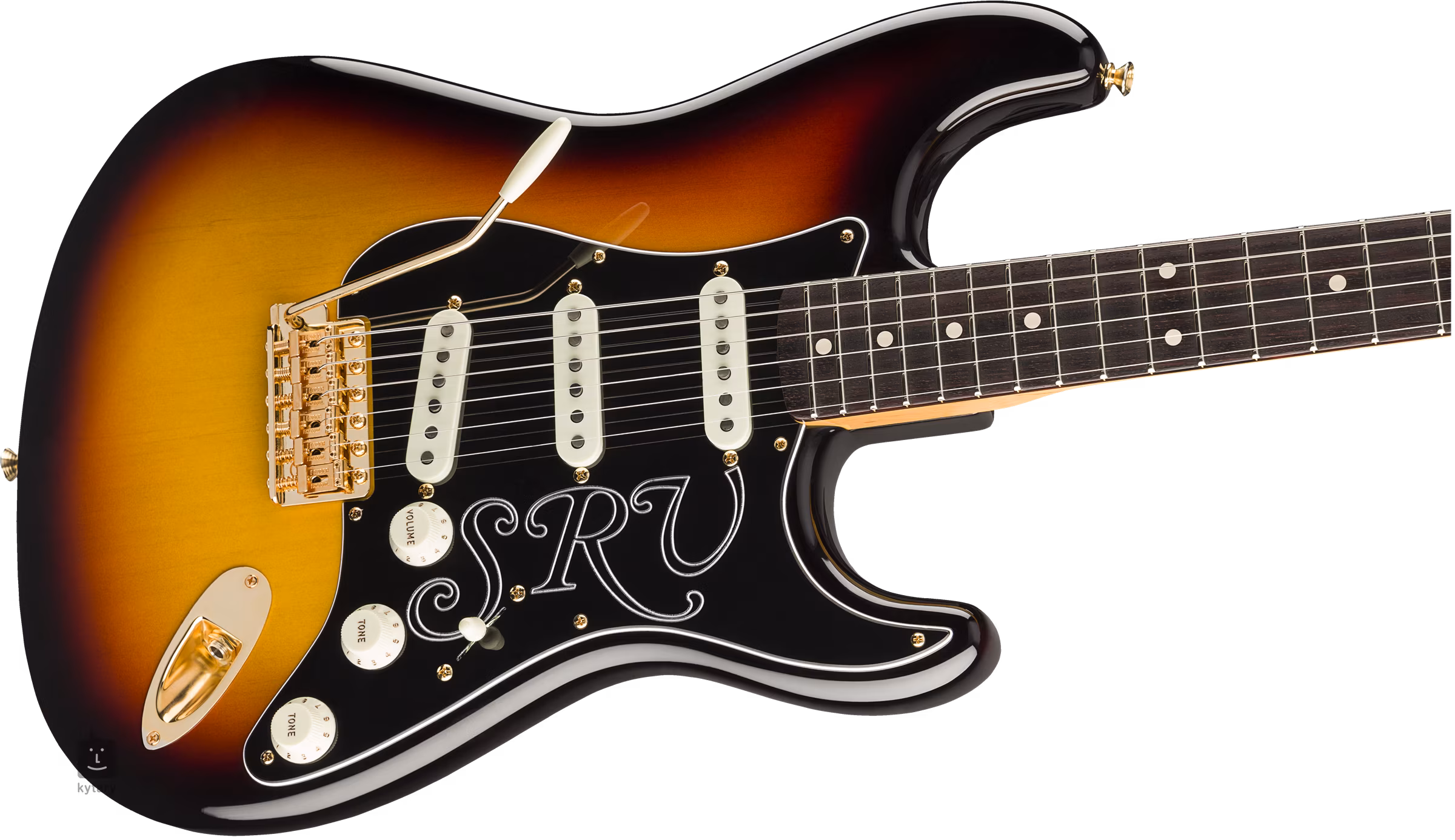 Stylový vzhled podtrhuje třívrstvý černý “SRV” pickguard a hardware ve zlatém provedení. Kytara je dodávána v kufru spolu s popruhem a certifikátem pravosti.