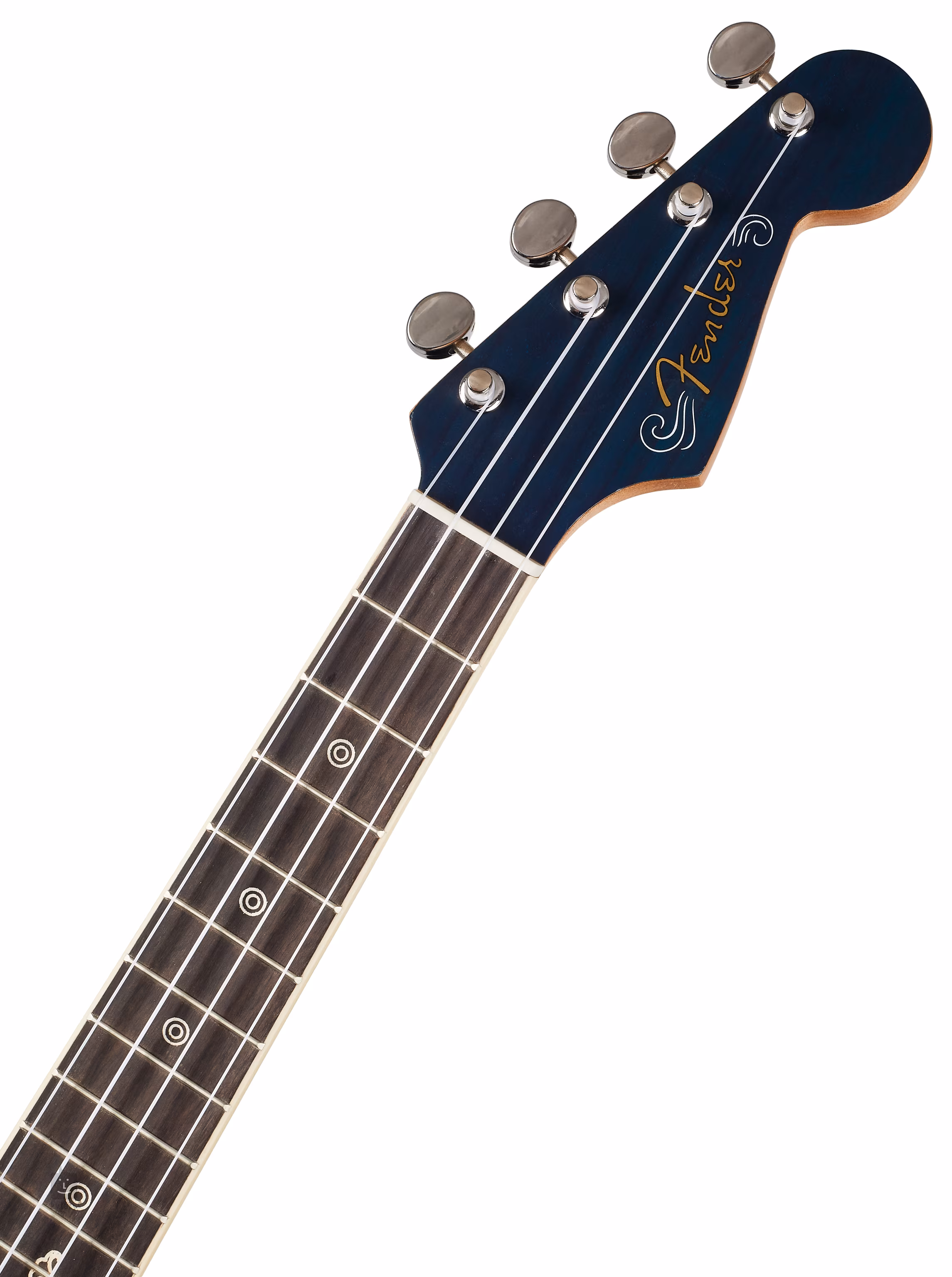 Tělo ukulele je zhotoveno z ovangkolu, přičemž přední deska je z masivu. Zadní desku zdobí rytiny. Ke krku ze dřeva nato je přilepen ořechový hmatník osazený devatenácti pražci. Orientaci po ploše hmatníku usnadňují zdobné polohové značky ve tvarech fází měsíce. Struny jsou uchyceny ve firemních otevřených niklových mechanikách v typickém Fender designu a ořechové kobylce.