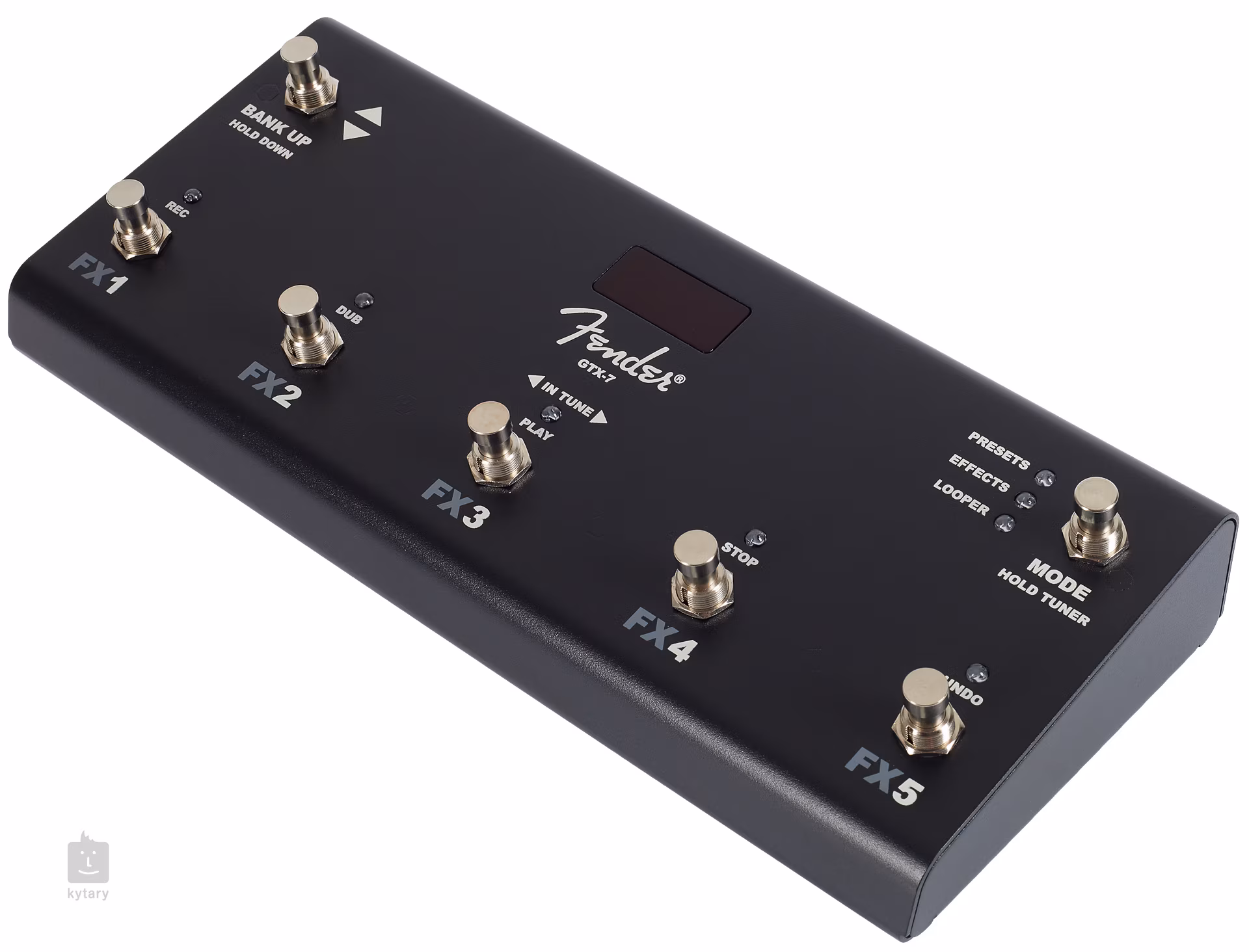 GTX-7 je multifunkční footswitch k aparátům Fender Mustang GTX, s jehož pomocí můžete jednoduše vybírat z efektů a presetů aparátu nebo ovládat looper. Pět spodních spínačů v režimu looperu nabízí funkce Record, Play, Overdub, Stop a Undo. Pomocí footswitche lze rovněž ovládat funkci tap tempo, přidržením přepínače Mode aktivujete chromatickou ladičku.