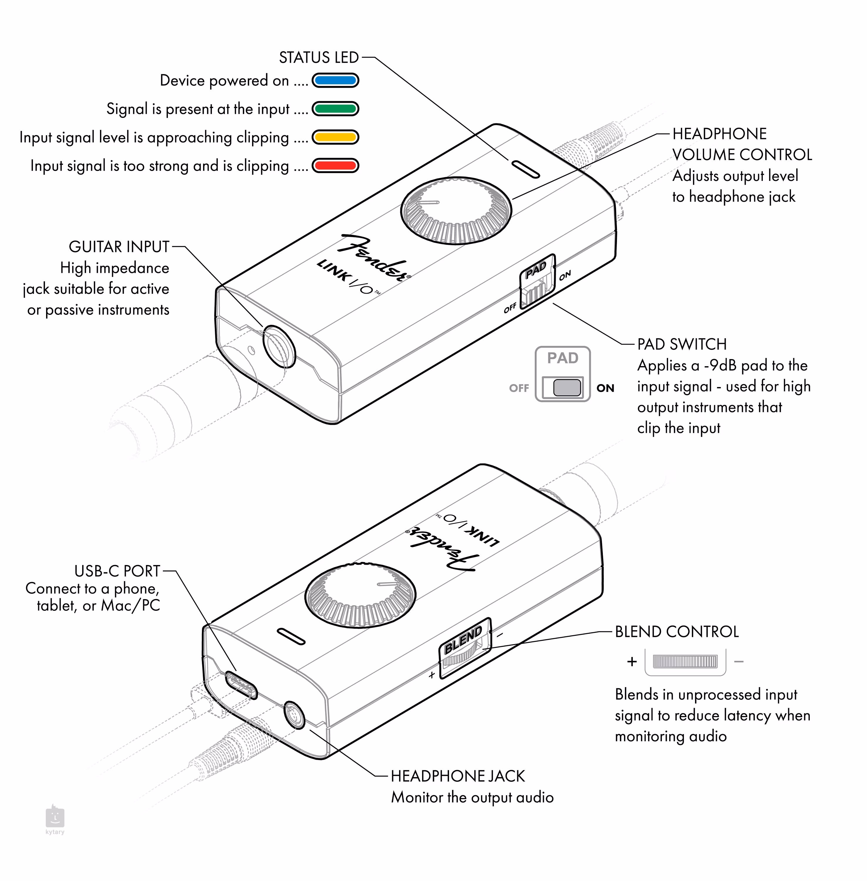 Díky vstupnímu zisku navrženému tak, aby kopíroval dynamickou odezvu světoznámých zesilovačů Fender (všetně možnosti volby pro aktivní elektroniku), a nekompromisnímu rozlišení 24 bit / 96 kHz přináší Fender Link I/O vysoce věrný tón z jakéhokoli pasivního nebo aktivního nástroje přímo do vašeho zařízení. Indikace vstupní úrovně a ovládání mixu poskytují dokonalý zážitek z monitoringu bez latence.