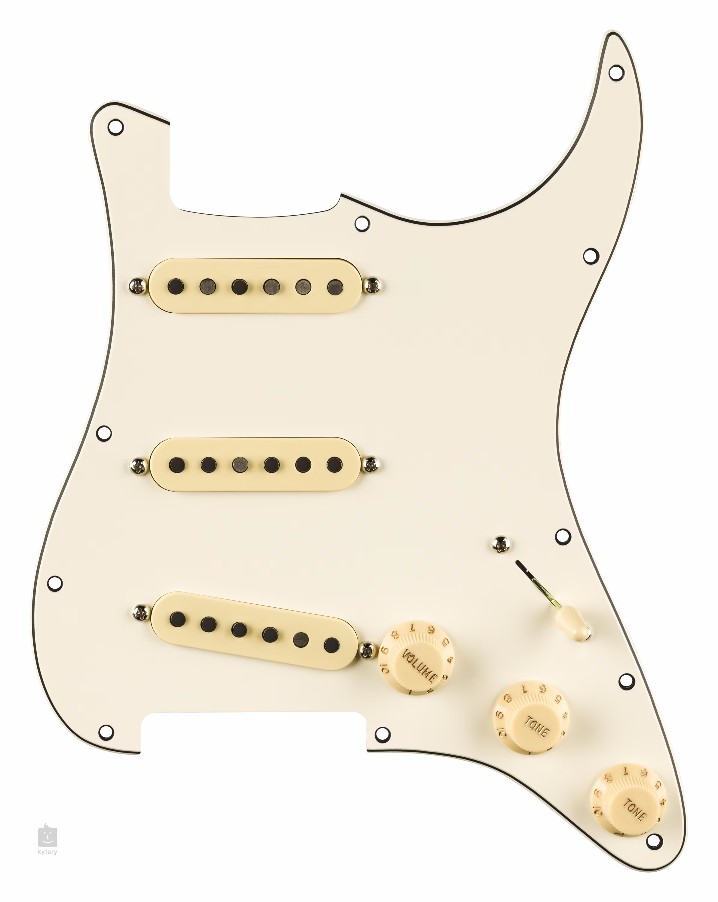 Pre-Wired Strat Pickguard, Pure Vintage '59 w/RWRP Middle, Black 11 Hole PG je třívrstvý pickguard (parchment) se třemi single-coil snímači Pure Vintage '59 Single-Coil Strat, potenciometry hlasitosti a tónové clony a pětipolohovým přepínačem snímačů. Jednotlivé dráty/kontakty jsou připájené, takže na vás zbývá minimum práce - jednoduše odstraňte starý pickguard, připájejte zbývající dráty (výstupní jack, uzemnění) a přišroubujte nový pickguard.