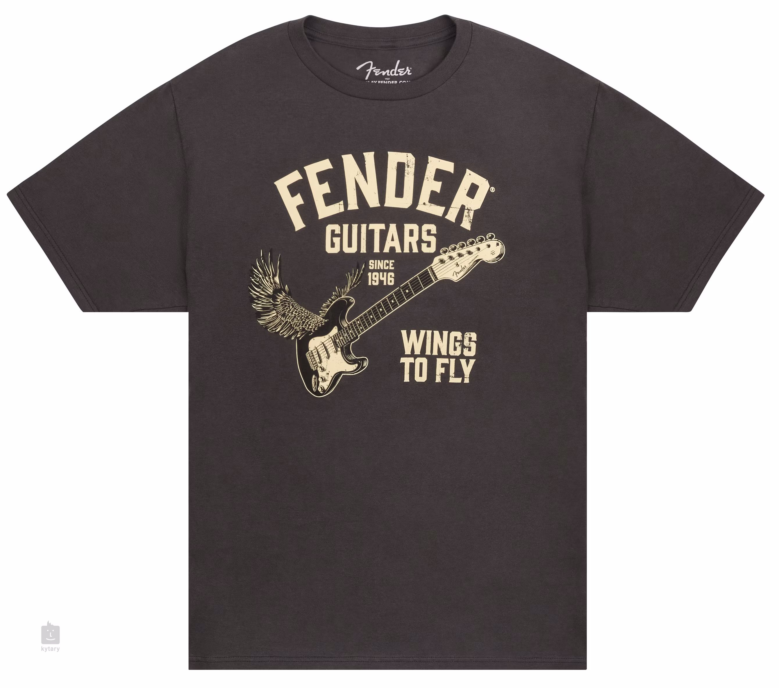 Grafický design triček Fender Wings To Fly T-Shirt Vintage Black vychází z citátu Leo Fendera, který prohlásil že: “všichni umělci jsou andělé a naší prací je poskytovat jim křídla”. Tričko je zhotoveno ze 100% bavlny a je k dostání v různých velikostech.