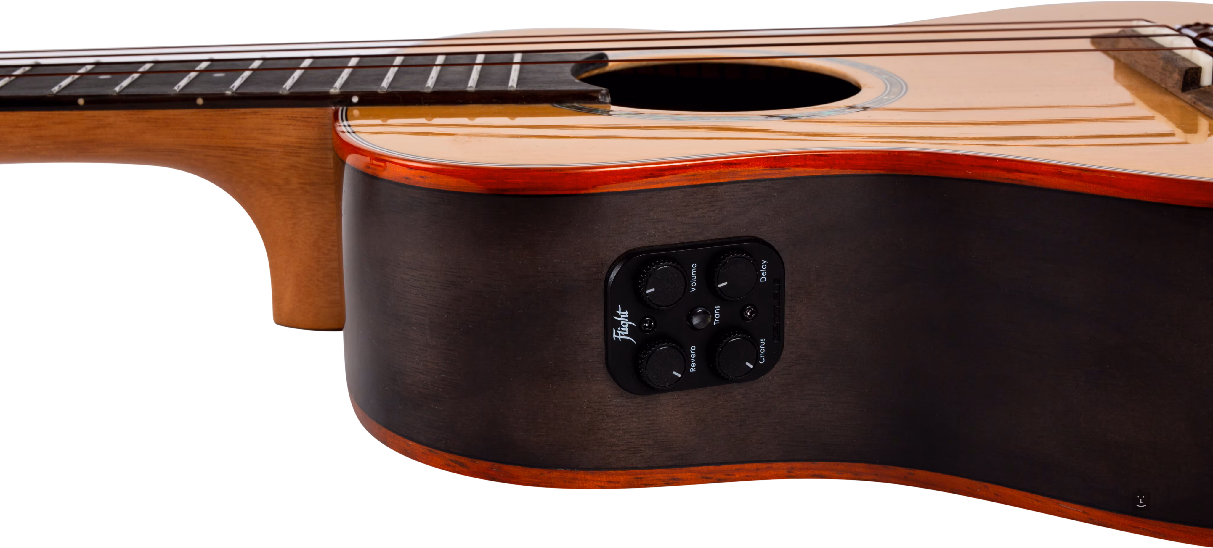 Flight Soundwave Pickup System vám umožní obohatit akustický zvuk nástroje o efekty delay, reverb a chorus, a to jak při zapojení do aparátu, tak i bez. Systém funguje tak, že podkobylkový piezo snímač pošle signál do digitálního procesoru, který jej zprocesovaný přepošle do aktuátoru umístěného na zadní desce ukulele. Ten poté distribuuje vibrace do celého těla. V případě zapojení do aparátu je interní systém bypasován.