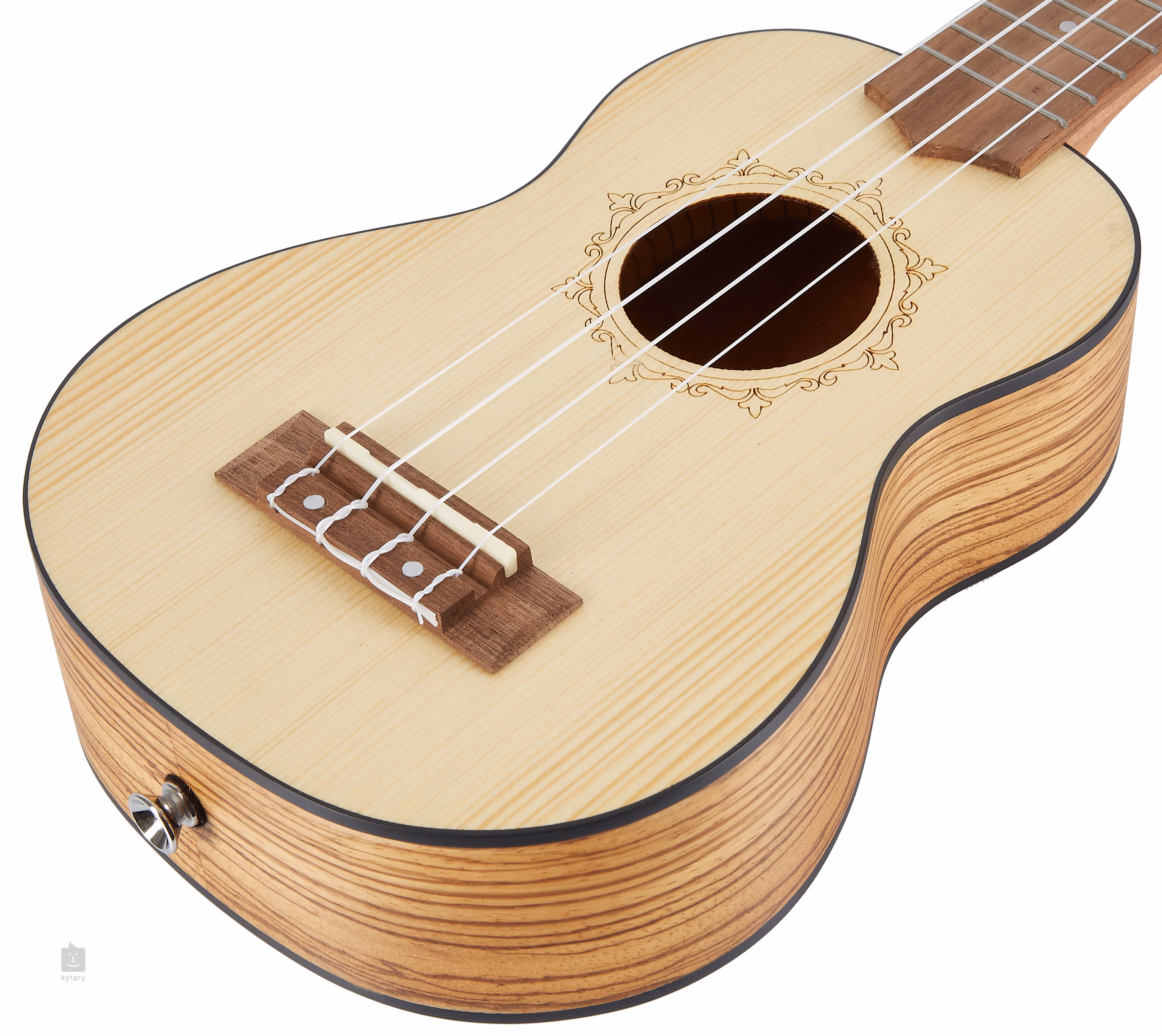 Tělo tohoto sopránového ukulele je složené z přední desky z laminovaného smrku a zadní desky a lubů z laminovaného exotického zebrana (zebrawood) s kresbou dřeva, které pěkně kontrastuje se smrkovým topem. Krk a hmatník nástroje jsou vyrobeny z afrického okoumé a ořechu, což je rovněž poměrně často používaná kombinace dřev. Struny jsou přes nultý a sedlový pražec z kosti ukotveny v chromovaných ladicích mechanikách kytarového typu (Die-Cast Geared) a ořechové kobylce. Úspornější design zpestřuje v případě modelů z řady Designer Series rozeta v podobě dekorativní laserové rytiny.