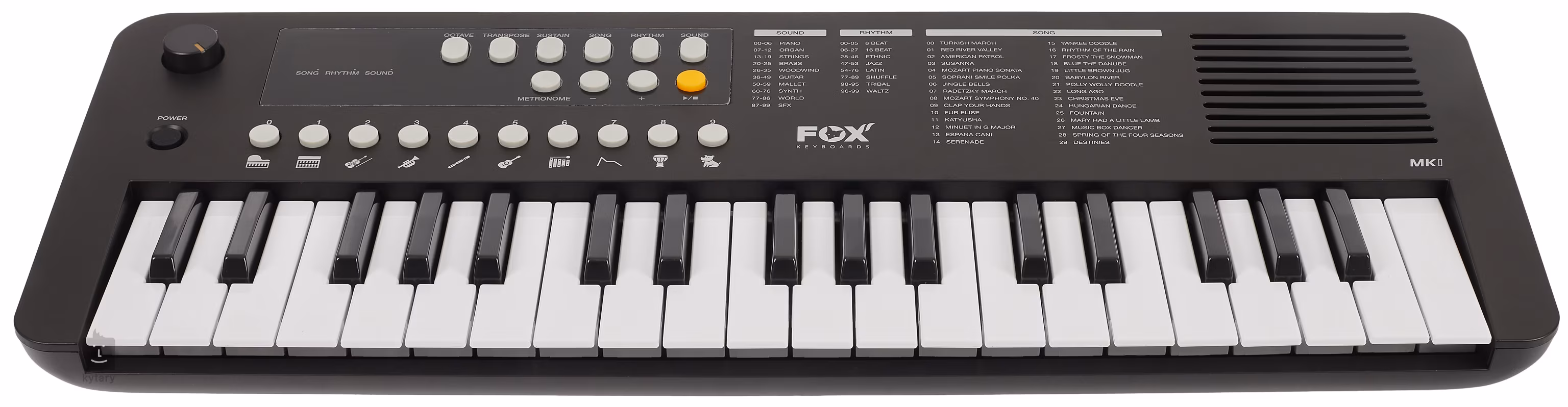 FOX Keyboards MK1 je jednoduchý dětský keyboard se 37 mini klávesami, 99 zvuky, 99 rytmy a 29 songy.