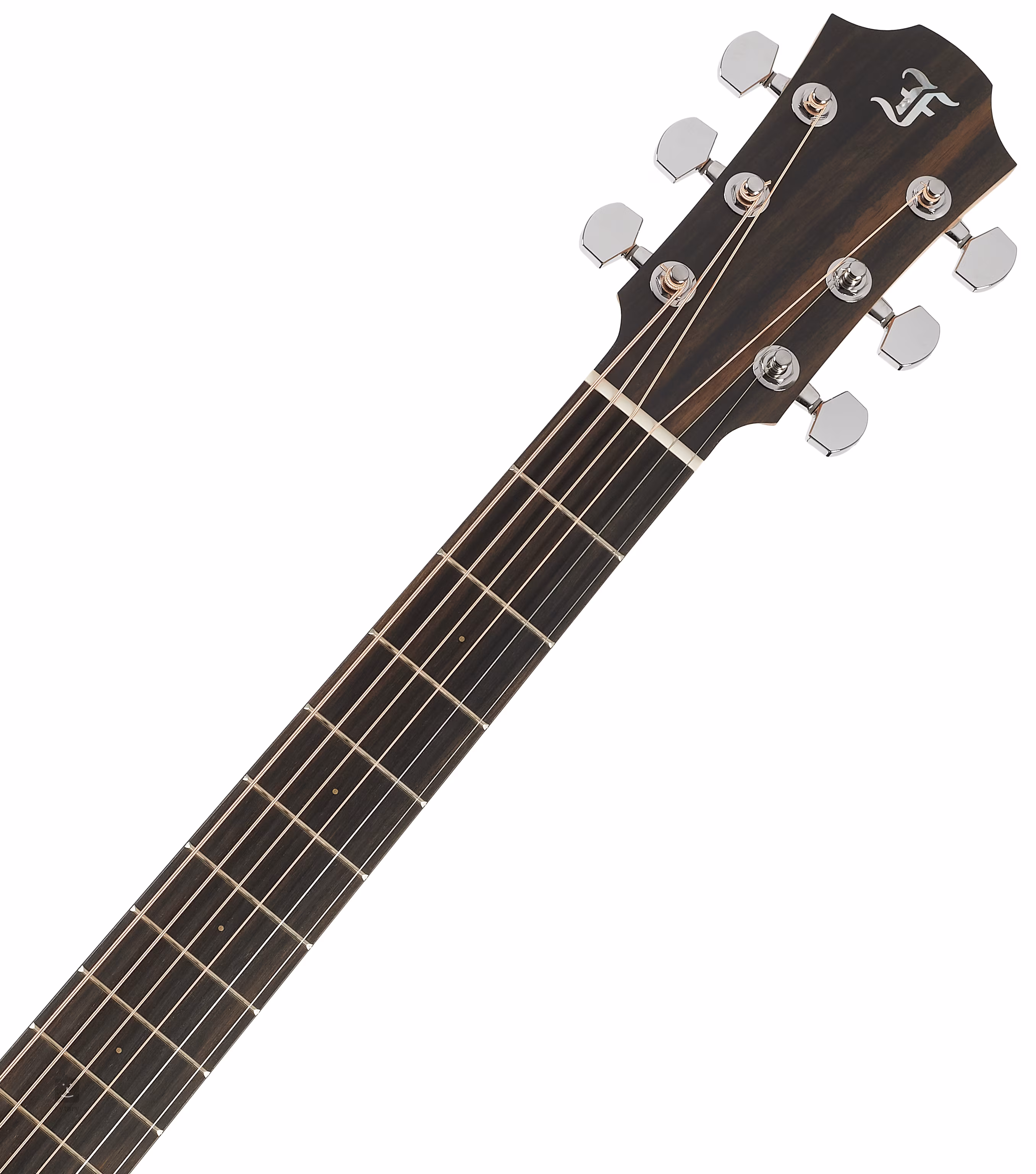 Pěkné zpracování kytar Furch Blue Plus podtrhuje lemovka z imitace želvoviny, rozeta tvořená dvojitým prstencem s vykládáním z černého ořechu, kartáčované pražce a transparentní pickguard, který nechává vyniknout přirozenou krásu dřeva. Orientaci na ebenovém hmatníku usnadňují boční a čelní bodové poziční značky. Přesné a stabilní ladění zaručují chromované firemní mechaniky s převodovým poměrem 1:18.