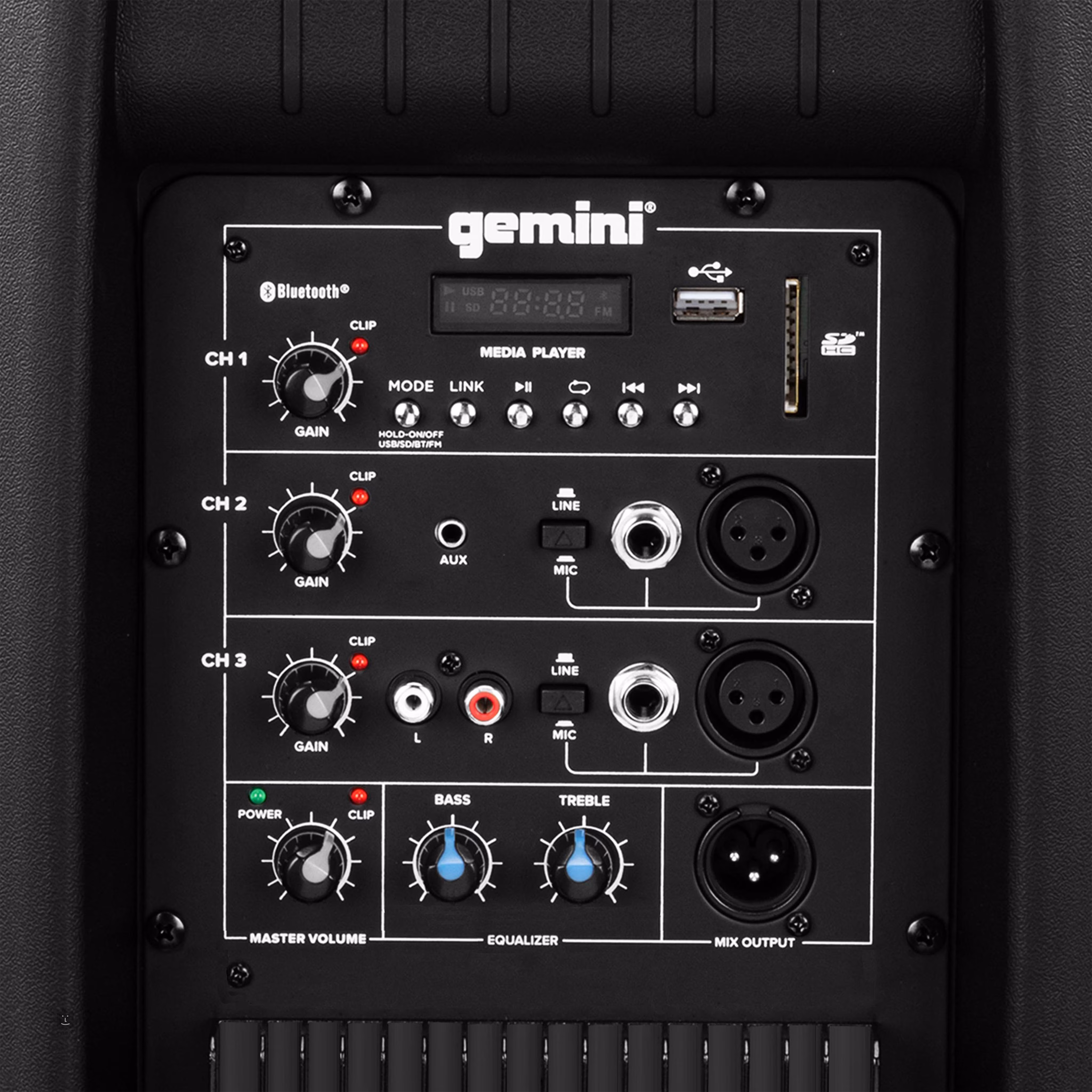 Reprobox disponuje třemi kanály. První z nich je osazen kvalitním přehrávačem externího audia, které připojíte pomocí USB, SD karty nebo Bluetooth. K dispozici je také integrovaný FM přehrávač pro vychytávání rádiových vln. Kanály 2 a 3 vám pak umožní připojit nástroj či mikrofon pomocí jackového nebo XLR vstupu. Kanál 2 je vybaven také konektorem jack 3,5 mm pro AUX in, zatímco kanál 3 zprostředkovává AUX in pomocí konektorů RCA. Každý z kanálů je vybaven vlastním ovladačem Gain. K dispozici je dále globální ovladač hlasitosti Master Volume a dvoupásmový ekvalizér (Bass, Treble). Na zadním panelu najdete také balancovaný XLR výstup pro propojení reproboxu s mixpultem.