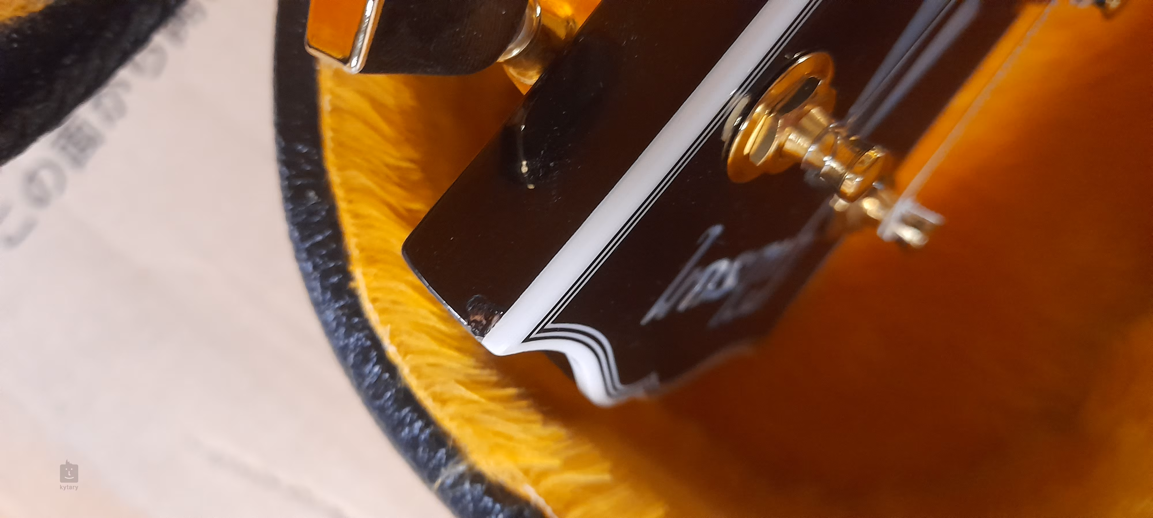 Masivní mahagonové tělo zdobí top ze dvou kusů fládrovaného javoru, efektní barevná úprava Bengal Burst a lesklý nitro lak. Díky komorování těla (9-hole) je nástroj lehčí a nebude tak zatěžovat vaši páteř jako kytary LP v tradičním provedení. K mahagonovému krku je přilepen ebenový hmatník osazený dvaadvaceti pražci velikosti Medium Jumbo. Orientaci po ploše hmatníku usnadňují perleťové poziční bloky (Mother of Pearl).