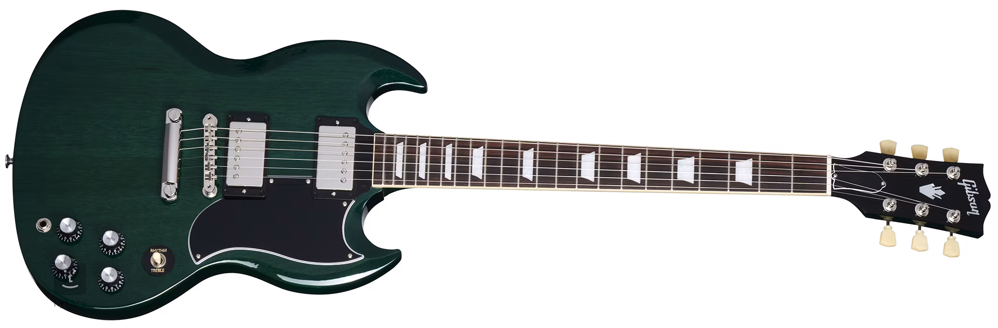 Elektrická kytara Gibson SG patří právem mezi nesmrtelné ikony rockové hudby. S jejím zvukem jsou spojena jména kytarových legend jako Carlos Santana, Pete Townshend a dalších velikánů rockové muziky. Mahagonové tělo kytary SG Standard '61 Stop Bar Translucent Teal zdobí barevná úprava Translucent Teal a tenká povrchová úprava v podobě laku z nitrocelulózy. K mahagonovému krku s profilem “SlimTaper” je přilepen palisandrový hmatník osazený dvaadvaceti pražci velikosti Medium Jumbo. Orientaci na hmatníku usnadňují polohové bloky z imitace perleti (Acrylic Trapezoid). O zvuk nástroje se starají dva 60s Burstbucker humbuckery s Alnico V magnety. Jejich expresivní tón odkazuje na pozdější modely snímačů PAF. Snímače jsou ručně připájené k potenciometrům hlasitosti a tónové clony a “orange drop” kondenzátorům. Mezi snímači lze přepínat třípolohovým switchem. Struny jsou přes nultý pražec z materiálu Graphtech uchyceny v ladicích mechanikách Vintage Deluxe s kolíčky Keystone a přes kobylku ABR-1 Tune-O-Matic ve struníku. Stylový design nástroje podtrhuje niklový hardware a černý pětivrstvý pickguard. Kytara je dodávána v kufru spolu se sadou příslušenství.