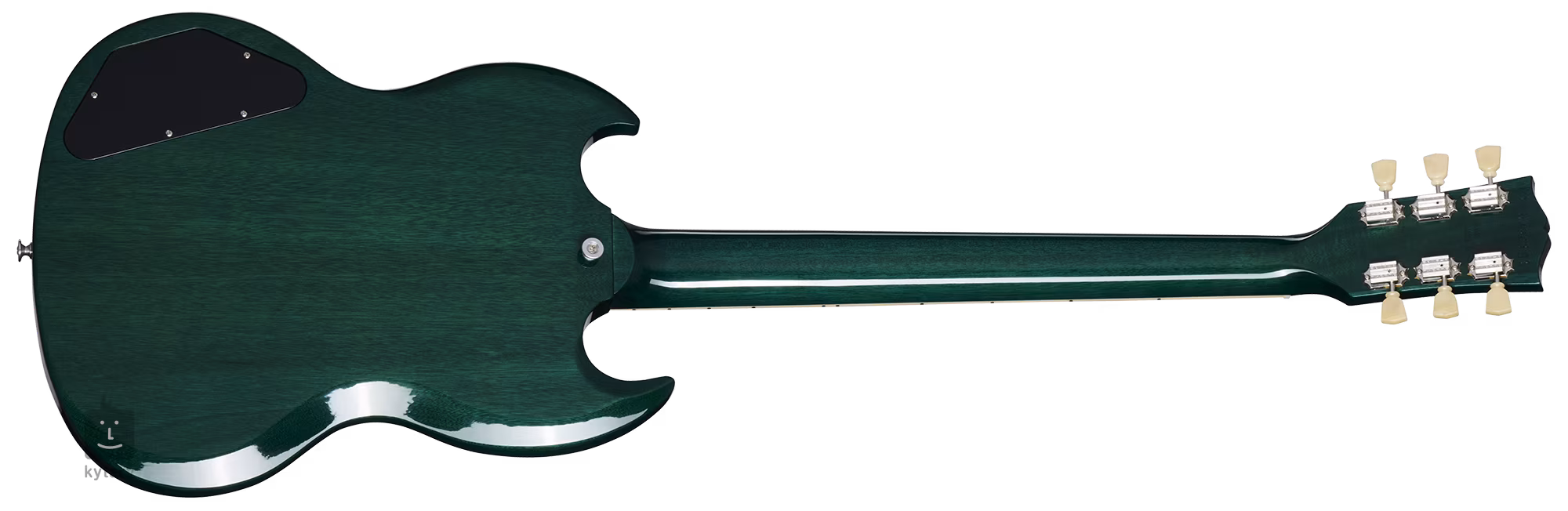 Mahagonové tělo kytary SG Standard '61 Stop Bar Translucent Teal zdobí barevná úprava Translucent Teal a tenká povrchová úprava v podobě laku z nitrocelulózy. K mahagonovému krku s profilem “SlimTaper” je přilepen palisandrový hmatník osazený dvaadvaceti pražci velikosti Medium Jumbo. Orientaci po jeho ploše usnadňují polohové bloky z imitace perleti (Acrylic Trapezoid).