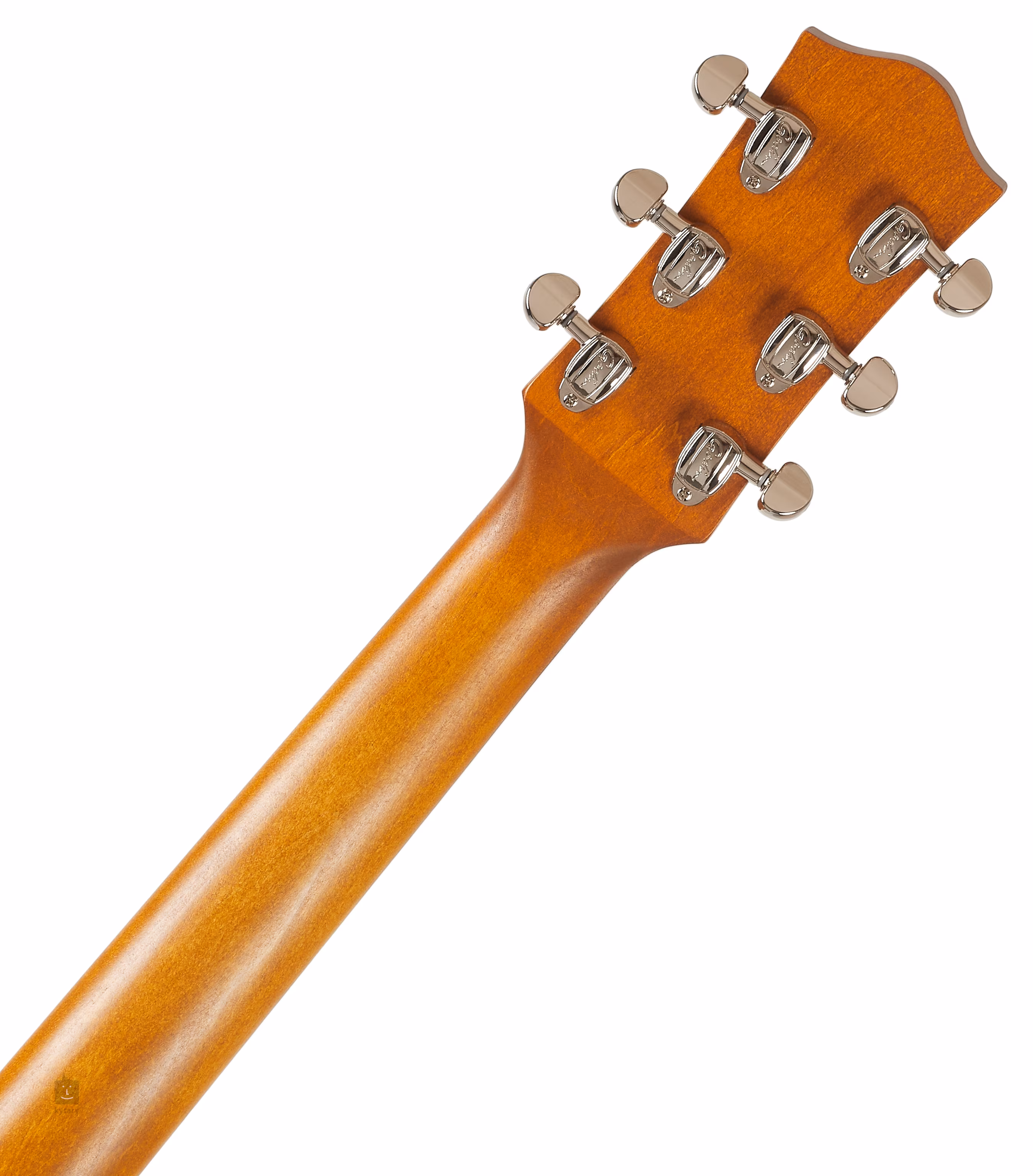 Model 5th Avenue Jumbo P90 Harvest Gold s hlubším tělem typu Jumbo nabízí krásně vřelý kulatý vintage tón, který vynikne v široké škále hudebních stylů - jazzu, delta blues, rocku, country a veškerými fúzemi těchto stylů. Tělo kytary je zhotoveno z vrstvené kanadské plané třešně. Ke krku ze stříbrolistého javoru je přilepen palisandrový hmatník osazený jednadvaceti pražci velikosti Medium. Orientaci na hmatníku usnadňují polohové bloky.