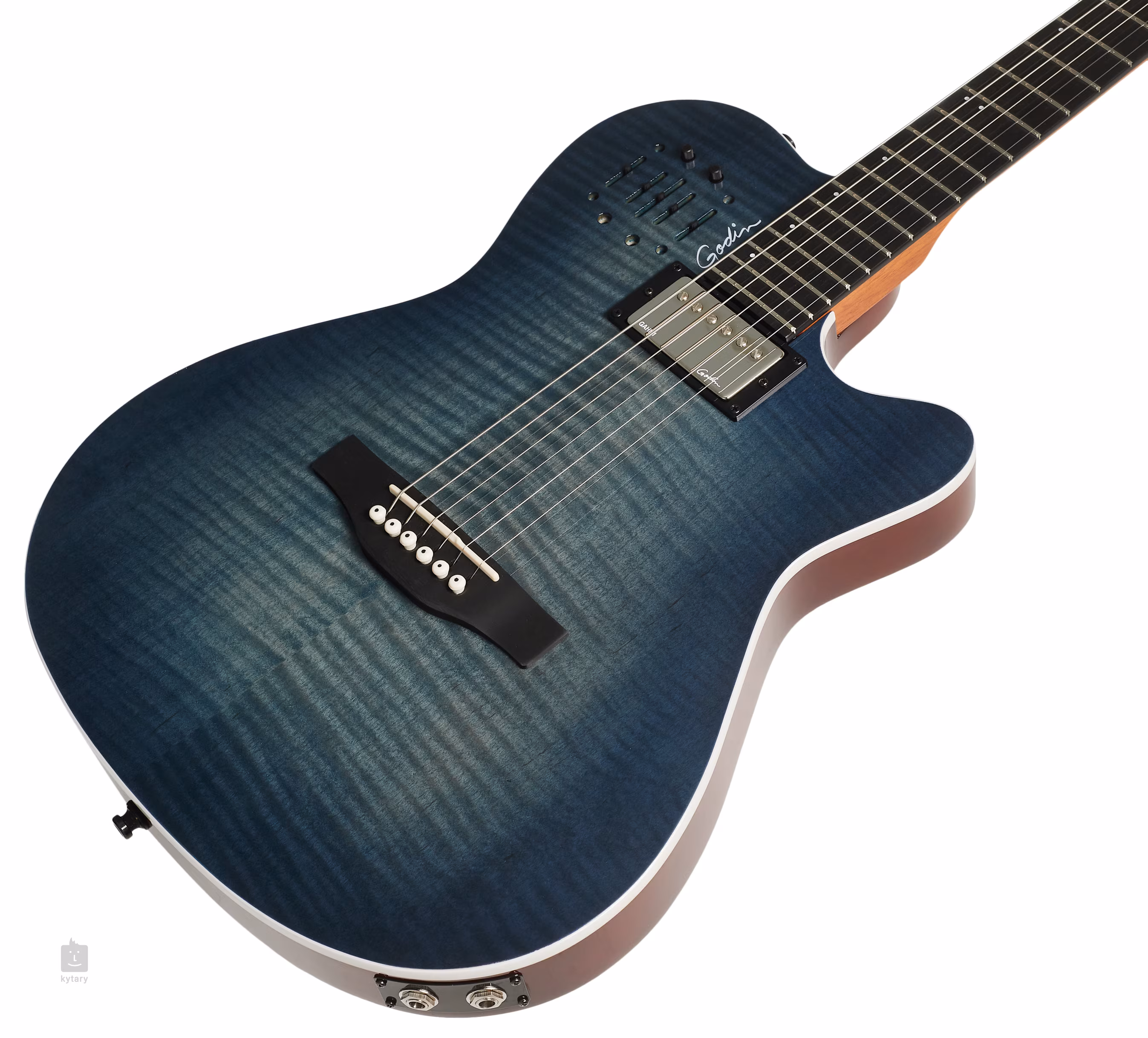 Kombinace snímání zvuku podkobylkovým piezo snímačem a u krku umístěným Godin Custom humbuckerem nabízí širokou paletu tónů ze světa akustických i elektrických kytar, které můžete v libovolném poměru míchat. Charakter zvuku upravíte pomocí ovladačů hlasitosti snímačů a třípásmového (piezo) a dvoupásmového (humbucker) ekvalizéru. Dva výstupy z kytary umožňují poslat ven čistě signál z humbuckeru nebo mix z obou snímačů.