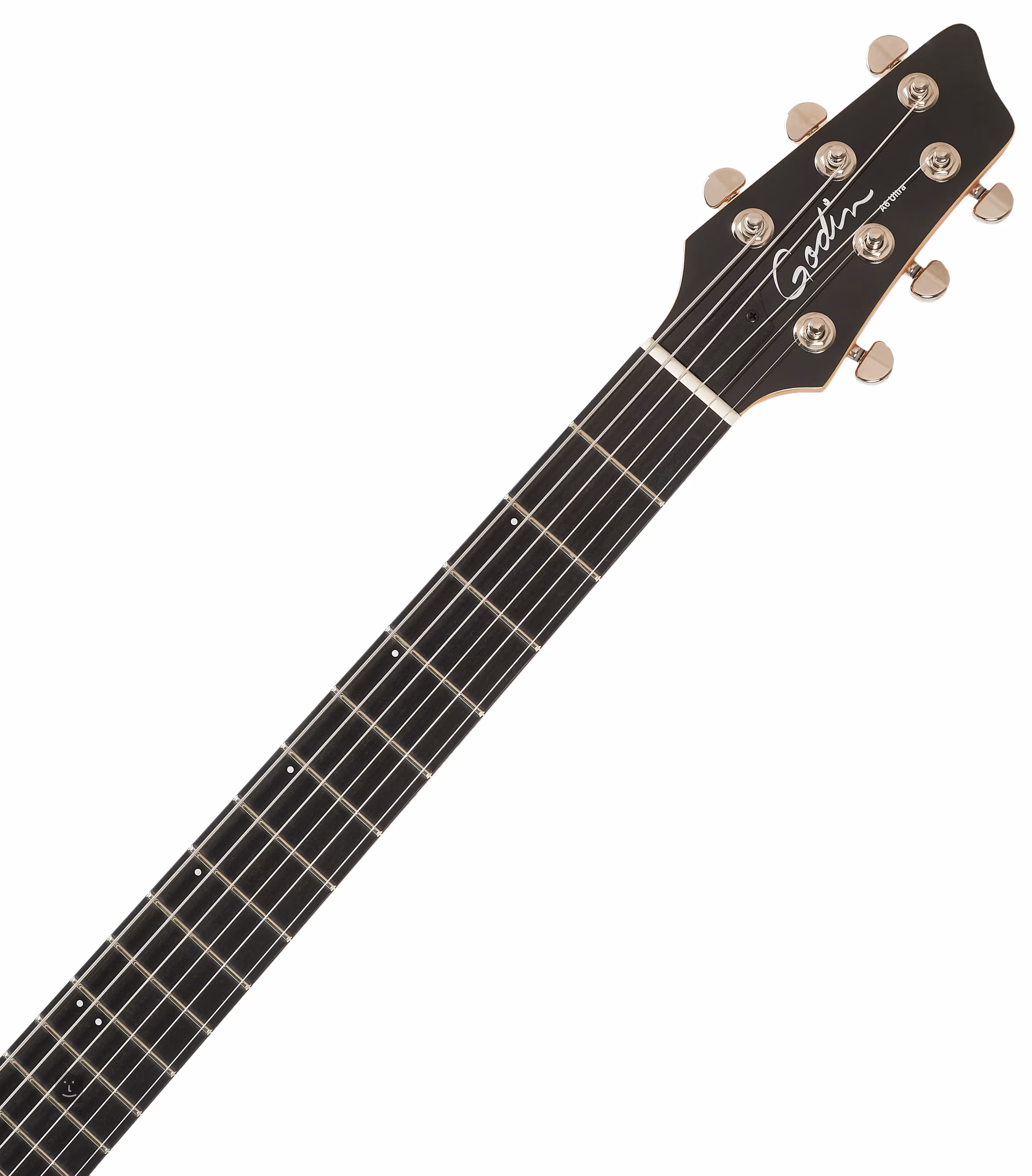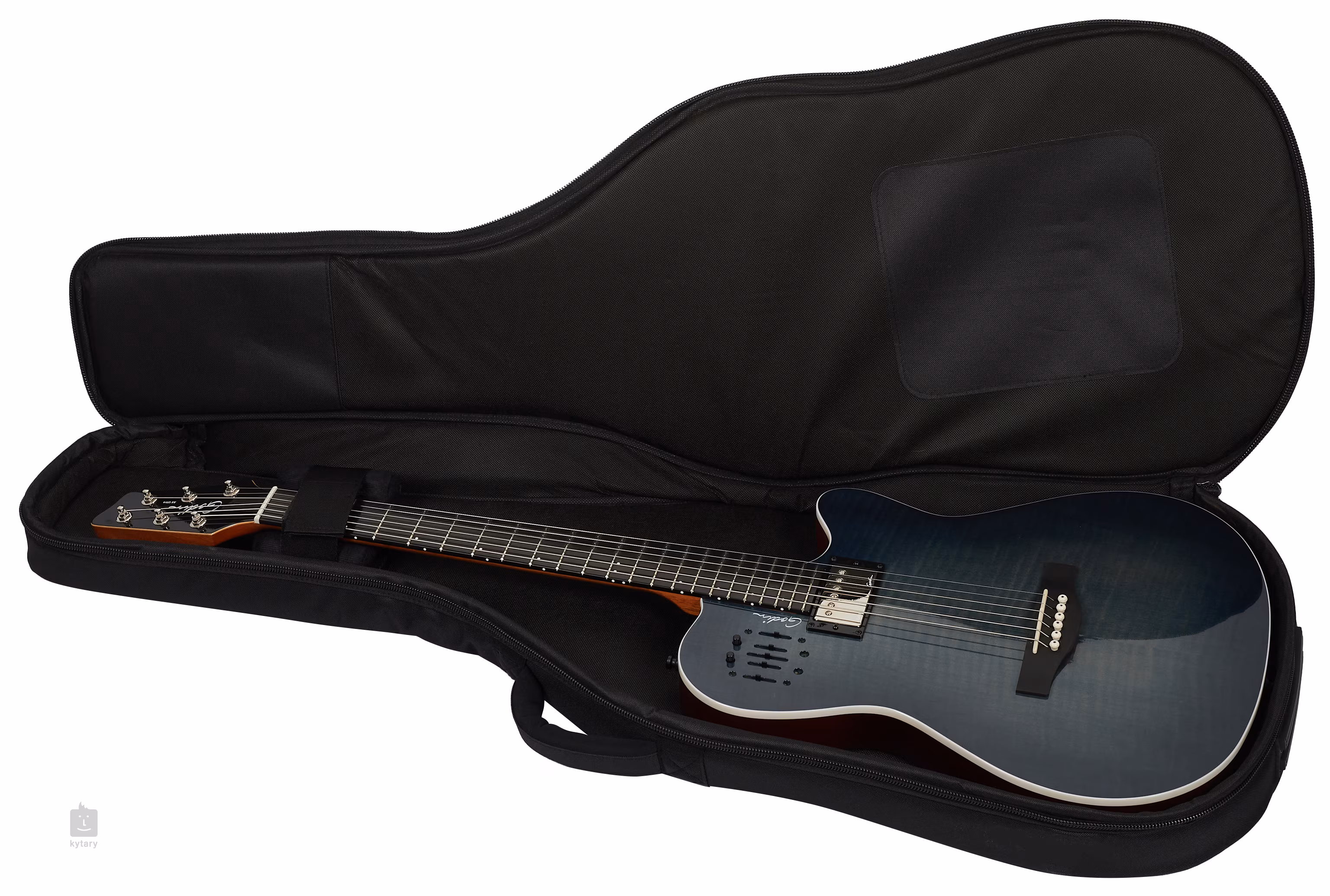 Tělo modelu Godin A6 Ultra Denim Blue je zhotovené z komorovaného stříbrolistého javoru. Top z masivu cedru zdobí dýha z prémiového figurovaného javoru. K mahagonovému krku je přilepen hmatník z moderního materiálu Richlite osazený dvaadvaceti pražci.