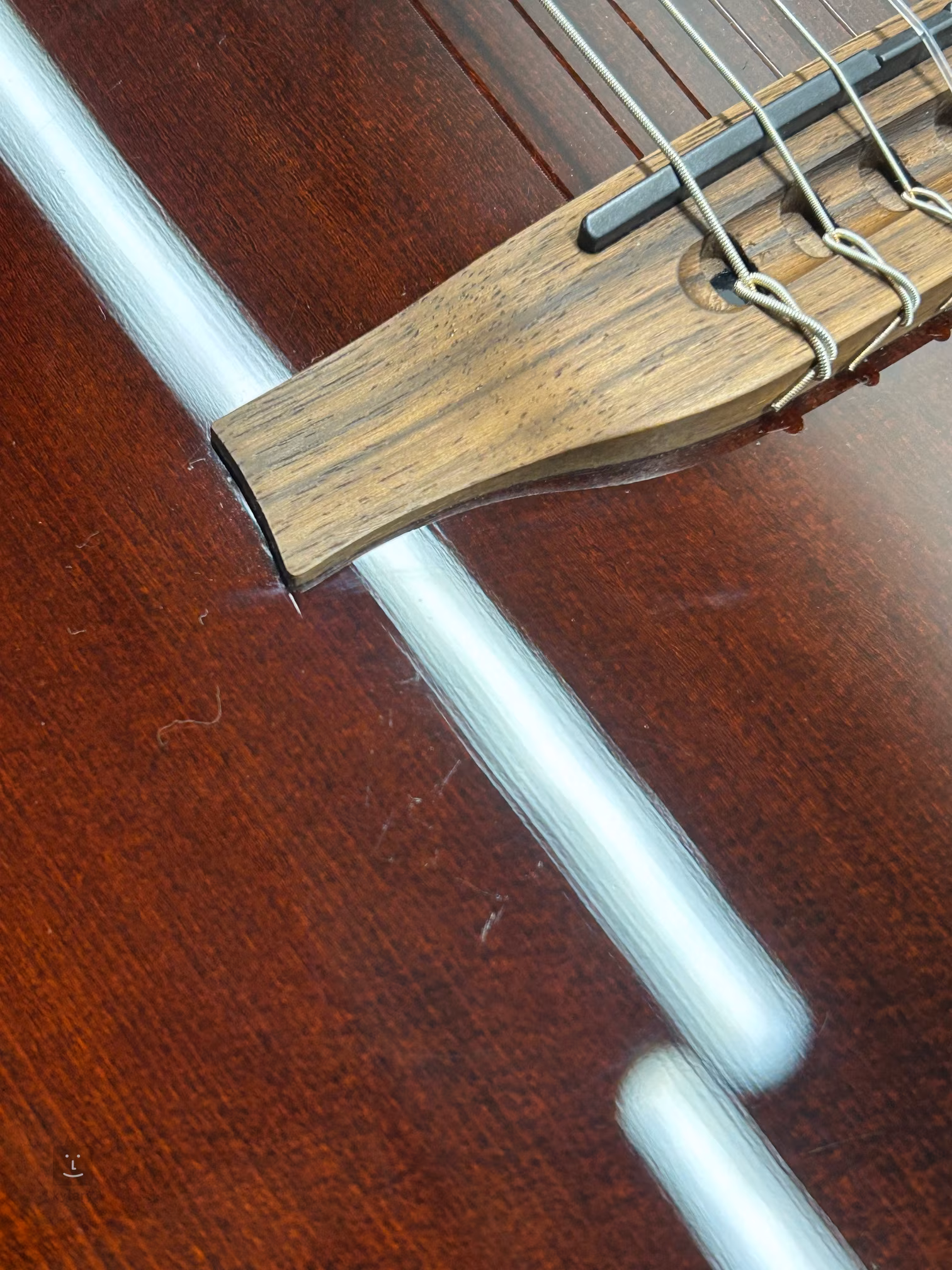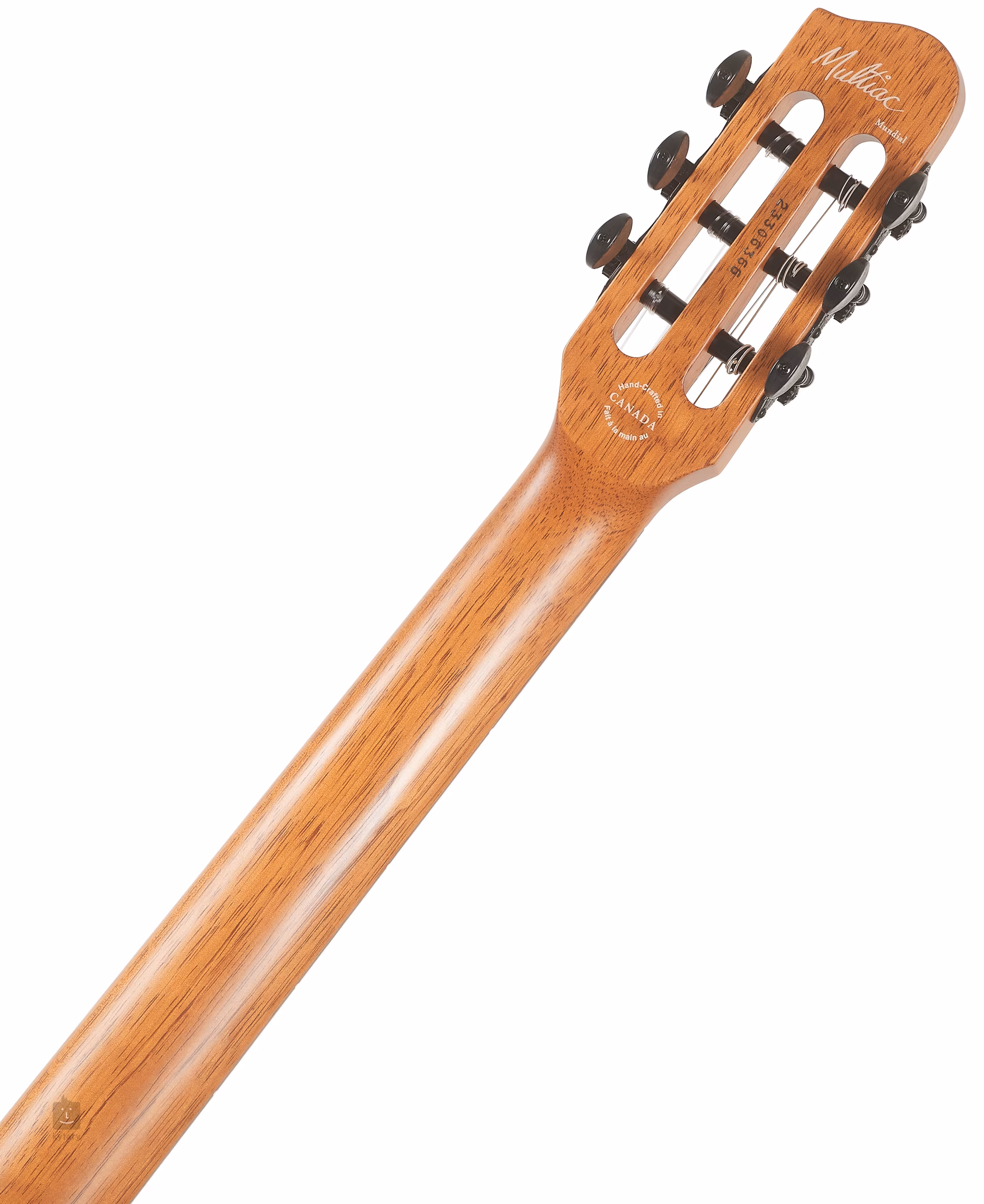 Základ zvuku klasické elektroakustické kytary Multiac Mundial Kanyon Burst tvoří lubové tělo ze stříbrolistého javoru a top z masivu cedru. K přišroubovanému krku ze španělského cedru je přilepen palisandrový hmatník osazený dvaadvaceti pražci. Nylonové struny kytary jsou uchyceny přes nultý pražec z materiálu Graphtech v klasických otevřených ladících mechanikách s převodovým poměrem 16:1 a palisandrové kobylce. Pěkné zpracování podtrhuje finiš Kanyon Burst.