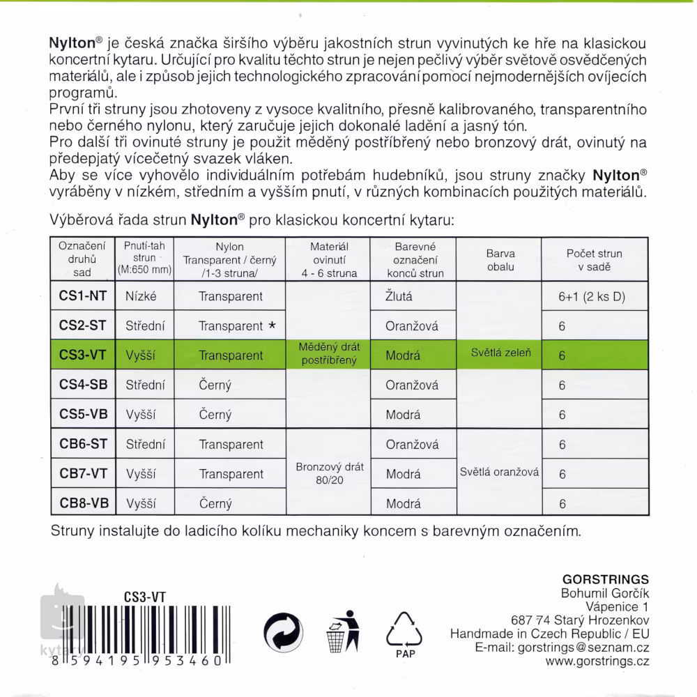 Nylonové struny pro klasickou kytaru z řady Nylton od českého výrobce Gorstrings jsou vyroby ze světově osvědčených materiálů za použití nejmodernějších technologií. Jejich základem je vysoce kvalitní, precizně kalibrované jádro z transparentního nylonu, které je u basových strun ovinuté oblíbenou postříbřenou mědí – ta strunám dodává vřelý, frekvenčně vyvážený zvuk, který skvěle vynikne při domácím cvičení, koncertním hraní i studiovém nahrávání. Struny při výrobě prošly rukama těch nejlepších českých řemeslníků. Tato sada nabízí vyšší pnutí, které zvyšuje ostrost a průraznost tónu.
