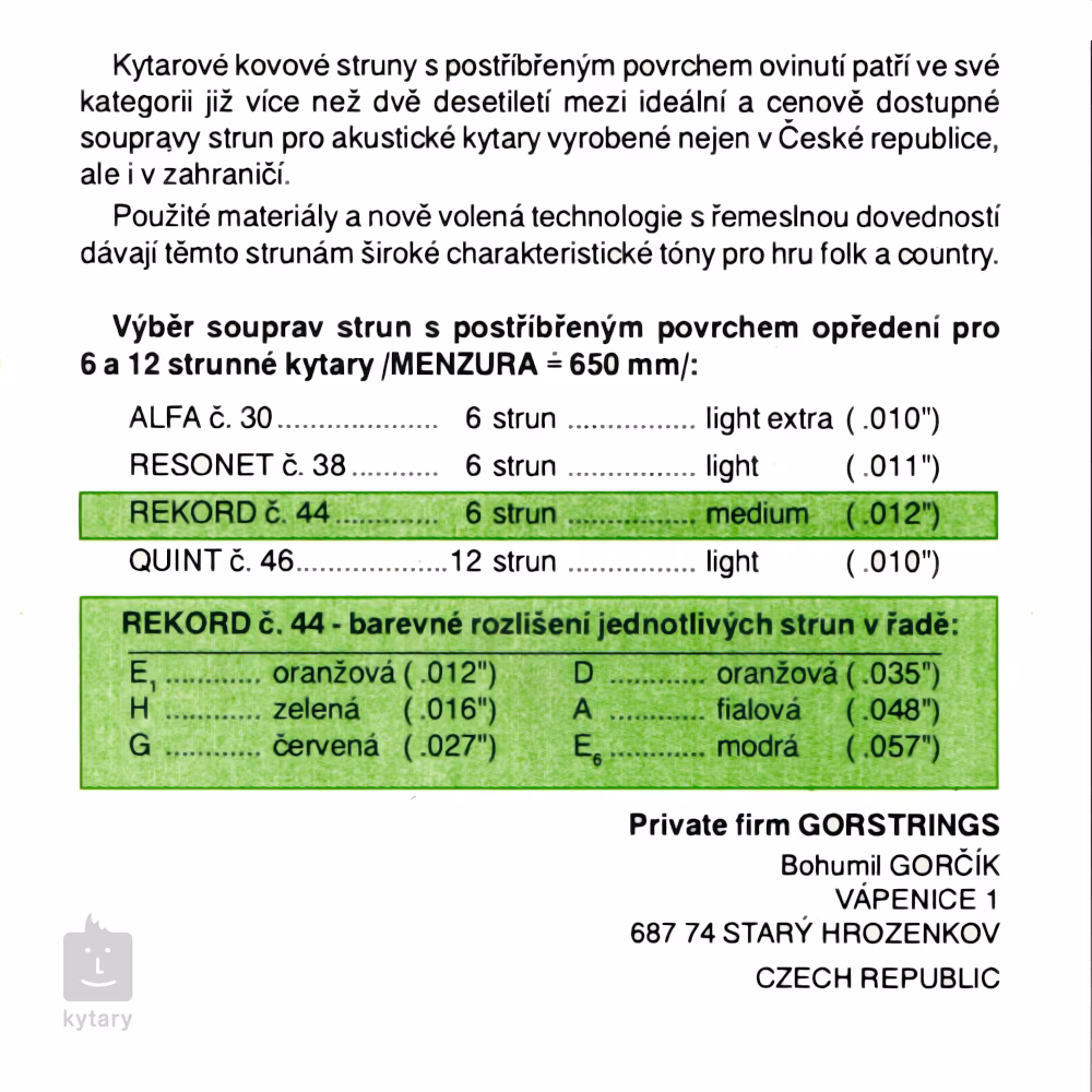 Struny pro akustické kytary Rekord od českého výrobce Gorstrings nabízí velmi konkrétní tón, který je ideální pro žánry jako folk nebo country. Jejich ocelové jádro je vinuté netradiční postříbřenou mědí, která jim dodává výjimečnou ostrost a průraznost. Pokud hledáte struny k táboráku nebo na country vystoupení, tahle sada by pro vás mohla být tou správnou volbou. Struny jsou vyrobeny z prvotřídních materiálů a prošly rukama těch nejlepších českých řemeslníků. Dopřejte své kytaře to nejlepší se strunami Gorstrings!