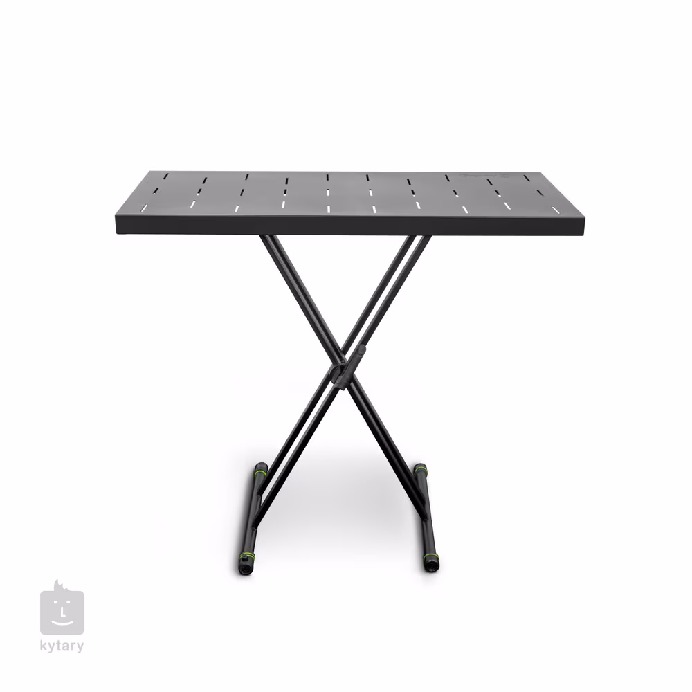 Robustní stojan s pracovní deskou vhodný pro DJ, producenty a klávesáky, kteří vyžadují od svého stojanu maximální stabilitu a spolehlivost. Stojan vyrobený z oceli se skládá z rozložitelné konstrukce ve tvaru X a pracovní desky o rozměrech 1000 x 480 mm. Konce stojanu navíc obsahují antivibrační gumové prvky a pracovní deska nabízí otvory pro kabely a připevnění vašich zařízení.