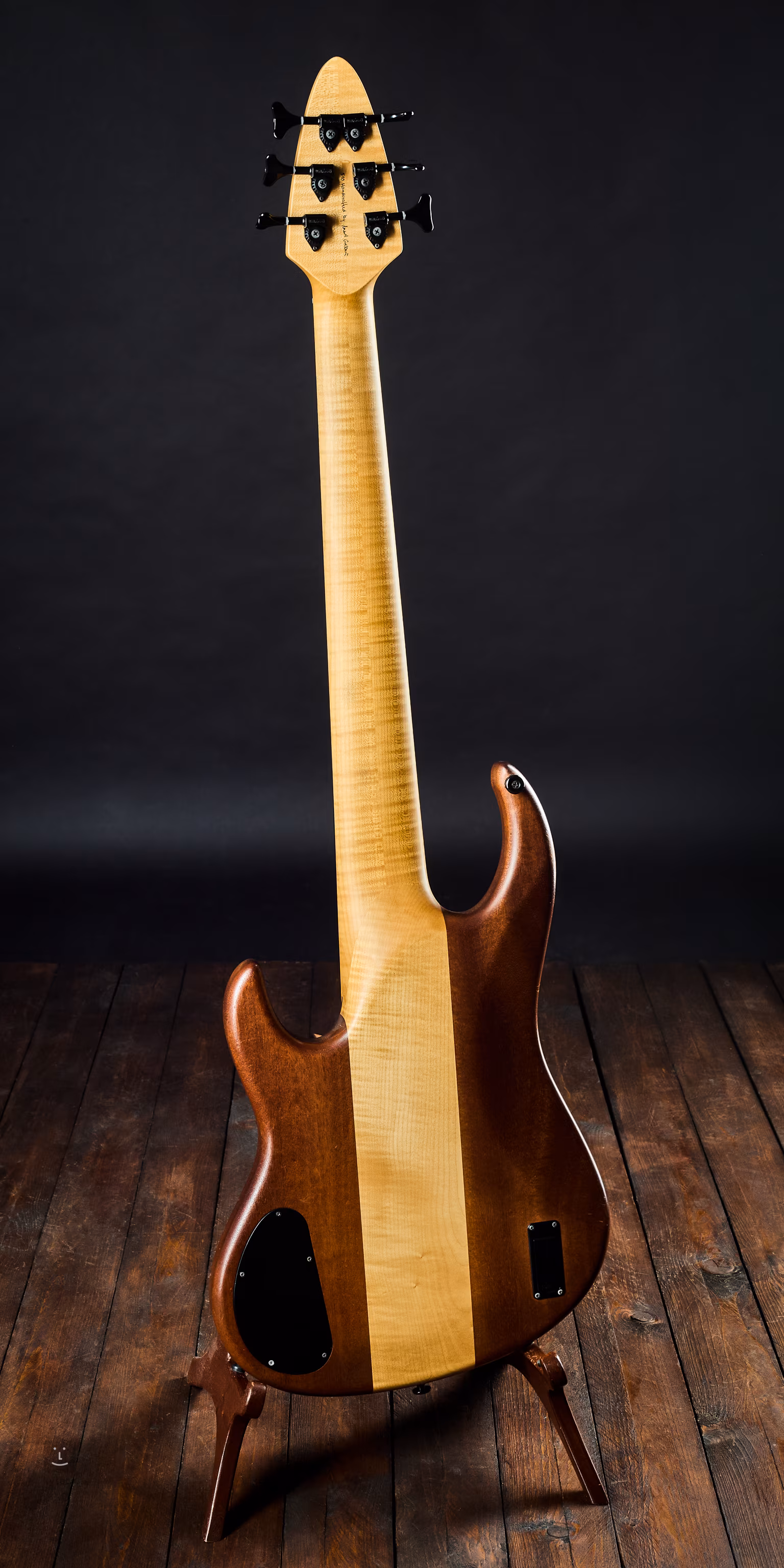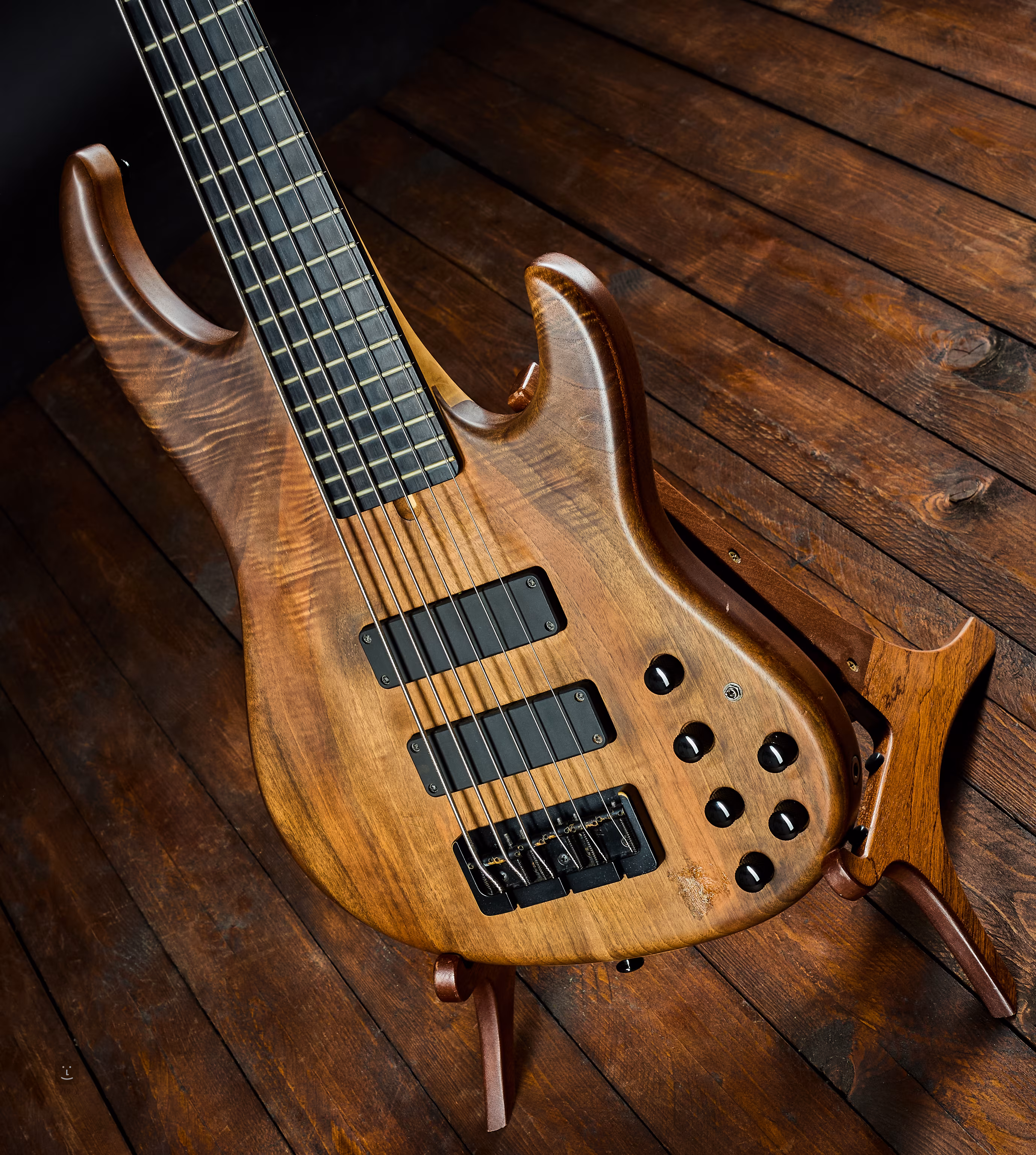 Průchozí krk je ze dvou částí fládrovaného javoru, v těle je jasanový toneblock, křídla jsou z mahagonu a ořechu.