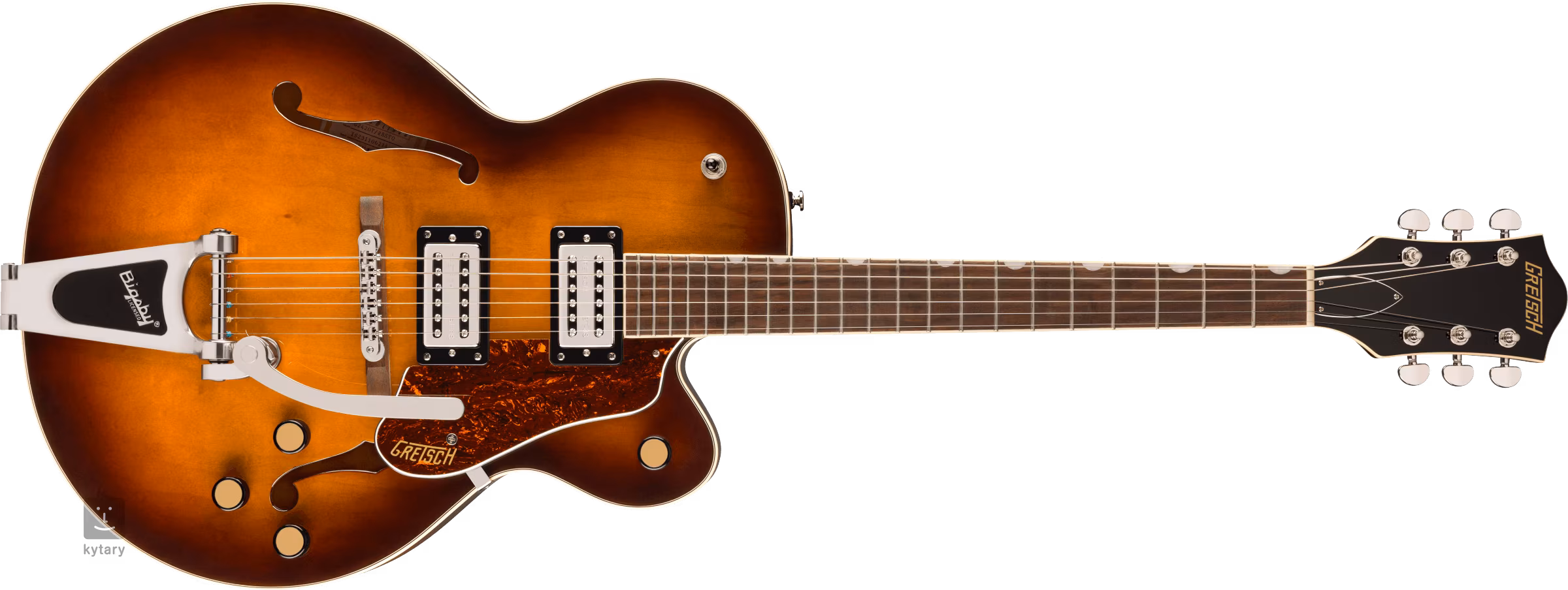 Struny jsou ukotveny přes nultý pražec z kosti ve firemních die-cast mechanikách a přes kobylku Adjusto-Matic usazené na dřevěné základně v licenčním tremolu Bigsby B60. Klasický oku lahodící design kytar Gretsch podtrhuje řada stylových prvků - od klenuté konstrukce těla s F otvory, elegantní lemovky s jemným nádechem patiny (Aged White), “radio” style potenciometrů, niklového hardware po třívrstvý pickguard z imitace želvoviny se zlatým logem Gretsch.