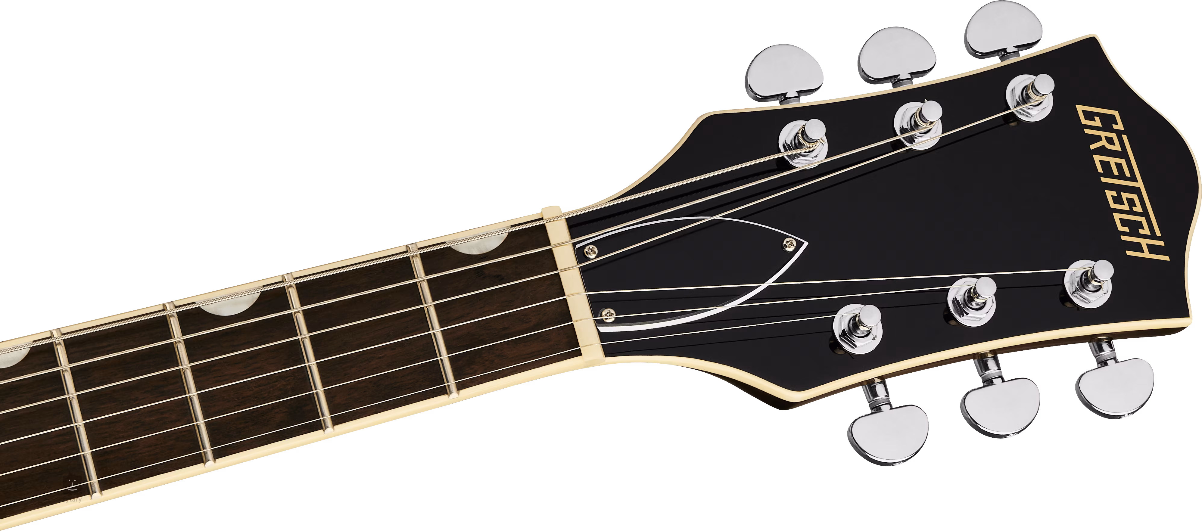 Struny jsou ukotveny přes nultý pražec z kosti ve firemních ladicích die-cast mechanikách a přes kobylku Adjusto-Matic ve struníku (V-Stop tailpiece). Klasický oku lahodící design kytar Gretsch podtrhuje řada stylových prvků - od klenuté konstrukce těla s F otvory, elegantní lemovky s jemným nádechem patiny (Aged White), niklového hardware po černý pickguard se zlatým logem Gretsch.