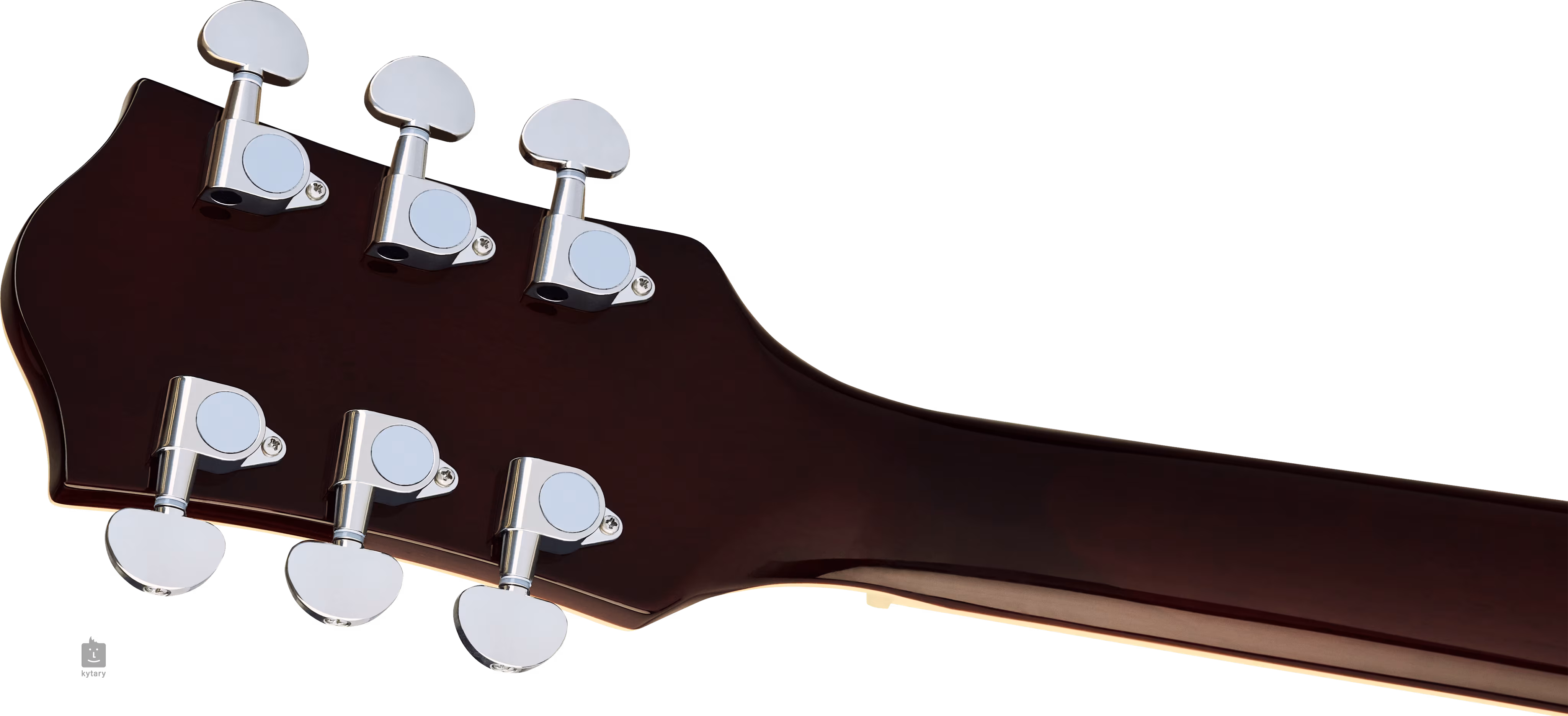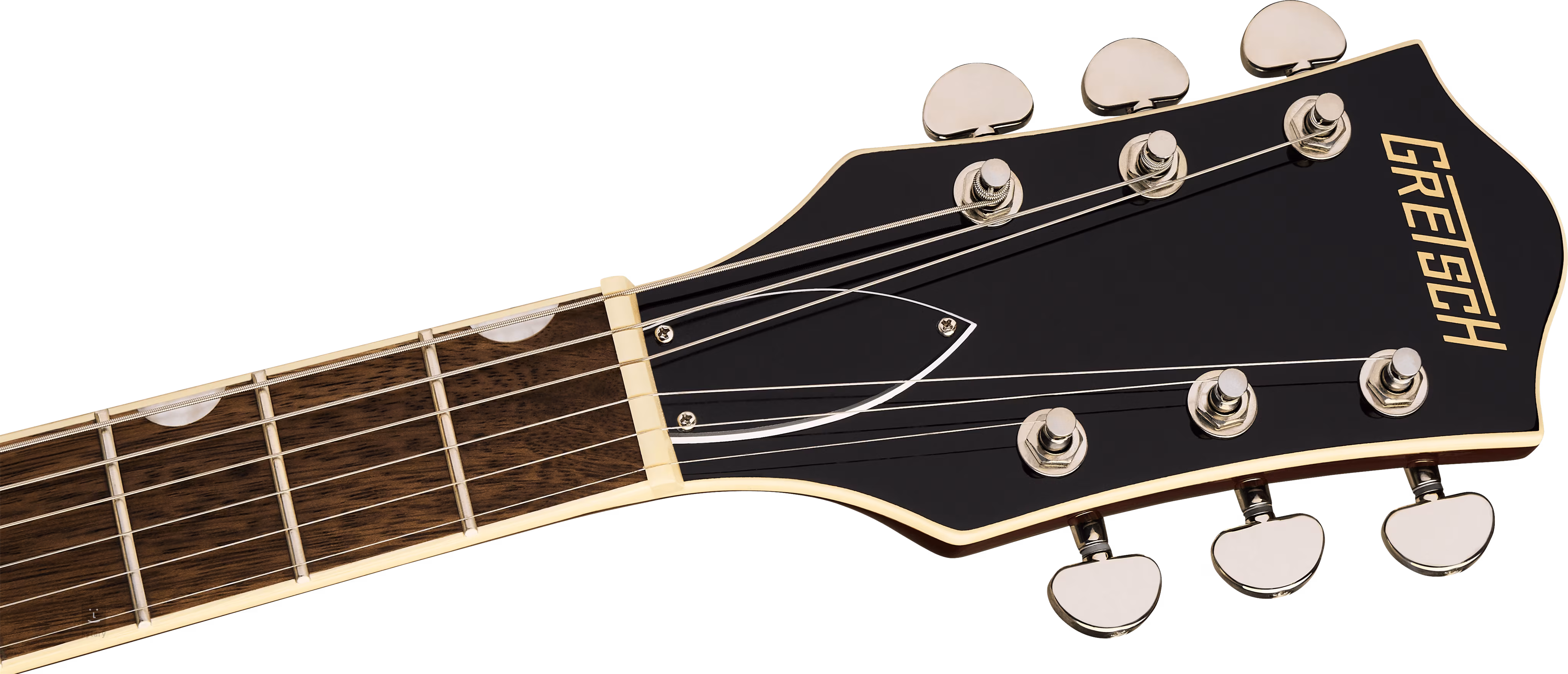 Struny jsou přes nultý pražec z kosti ukotveny ve firemních ladicích die-cast mechanikách a přes kobylku Adjusto-Matic v licenčním tremolu Bigsby B50. Klasický oku lahodící design kytar Gretsch podtrhuje řada stylových prvků - od klenuté konstrukce těla s F otvory, elegantní lemovky s jemným nádechem patiny (Aged White), niklového hardware po třívrstvý pickguard z imitace želvoviny se zlatým logem Gretsch.