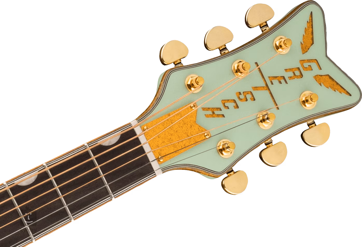 Elektroakustické kytary Rancher Penguin nabízí příjemné kompaktní tělo ve stylu modelů Parlor a tradiční firemní estetické prvky. Přední deska kytary G5021E Rancher Penguin Parlor Mint Metallic je zhotovena z masivu smrku, zadní deska a luby jsou vyrobeny z vrstveného javoru. K mahagonovému krku se „Standard U“ profilem je přilepen palisandrový hmatník osazený dvaceti pražci. Orientaci na hmatníku usnadňují offset polohové značky z imitace perleti (Neo-Classic Thumbnail).