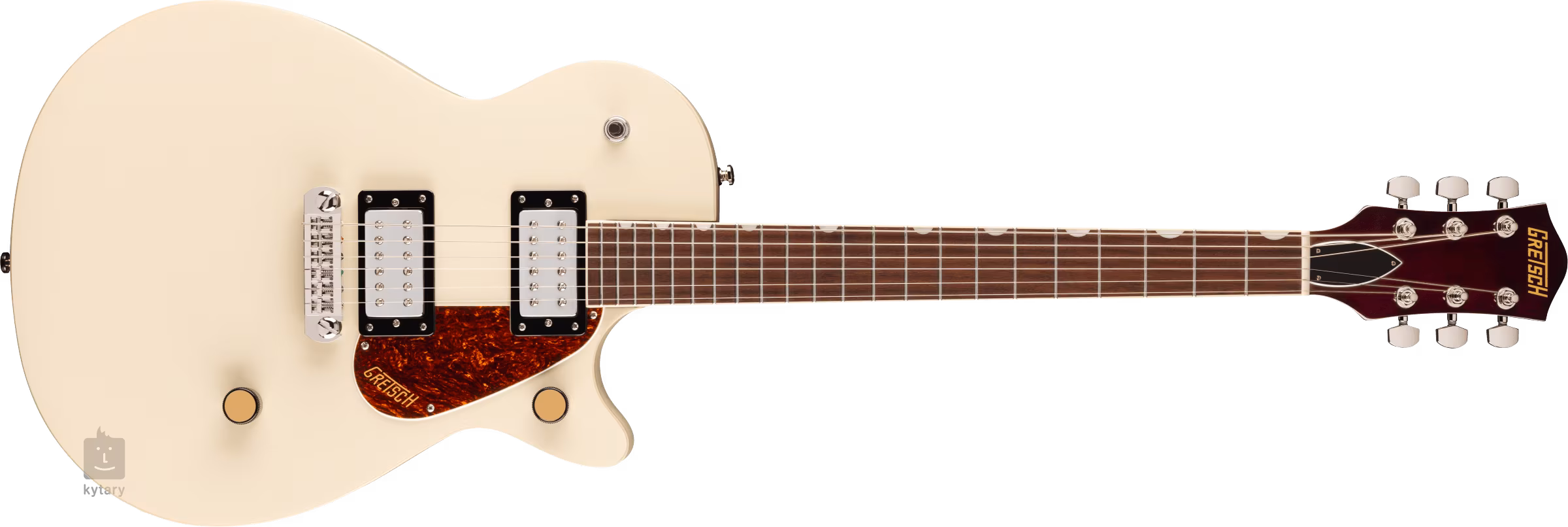 Elektrické kytary Jet Club z řady Streamliner nabízí zvuk a feel nástrojů značky Gretsch za dostupnou cenu. Jedná se o všestranné kytary s jednoduchým designem, které bez problémů využijete v řadě hudebních stylů. Tělo kytary Streamliner Jet Club Single-Cut Vintage White je zhotoveno ze dřeva nato. K přišroubovanému krku s profilem “Soft C” je přilepen hmatník z fíkovníku osazený dvaadvaceti pražci velikosti Medium Jumbo. Orientaci na hmatníku usnadňují offset polohové značky z imitace perleti (Neo-Classic Thumbnail). Od modelů Junior se Jet Club odlišuje dvěma zcela nově navrženými humbuckery Twin Six. Charakter zvuku upravíte pomocí ovladačů hlasitosti, tónové clony a třípolohového přepínače snímačů. Stabilní ladění zaručuje uchycení strun přes nultý pražec z kosti ve firemních die-cast ladicích mechanikách a v nastavitelném struníku (Wrap-Around). Pěkné zpracování podtrhuje niklový hardware, světlá lemovka (aged white) a pickguard z imitace želvoviny se zlatým logem Gretsch.