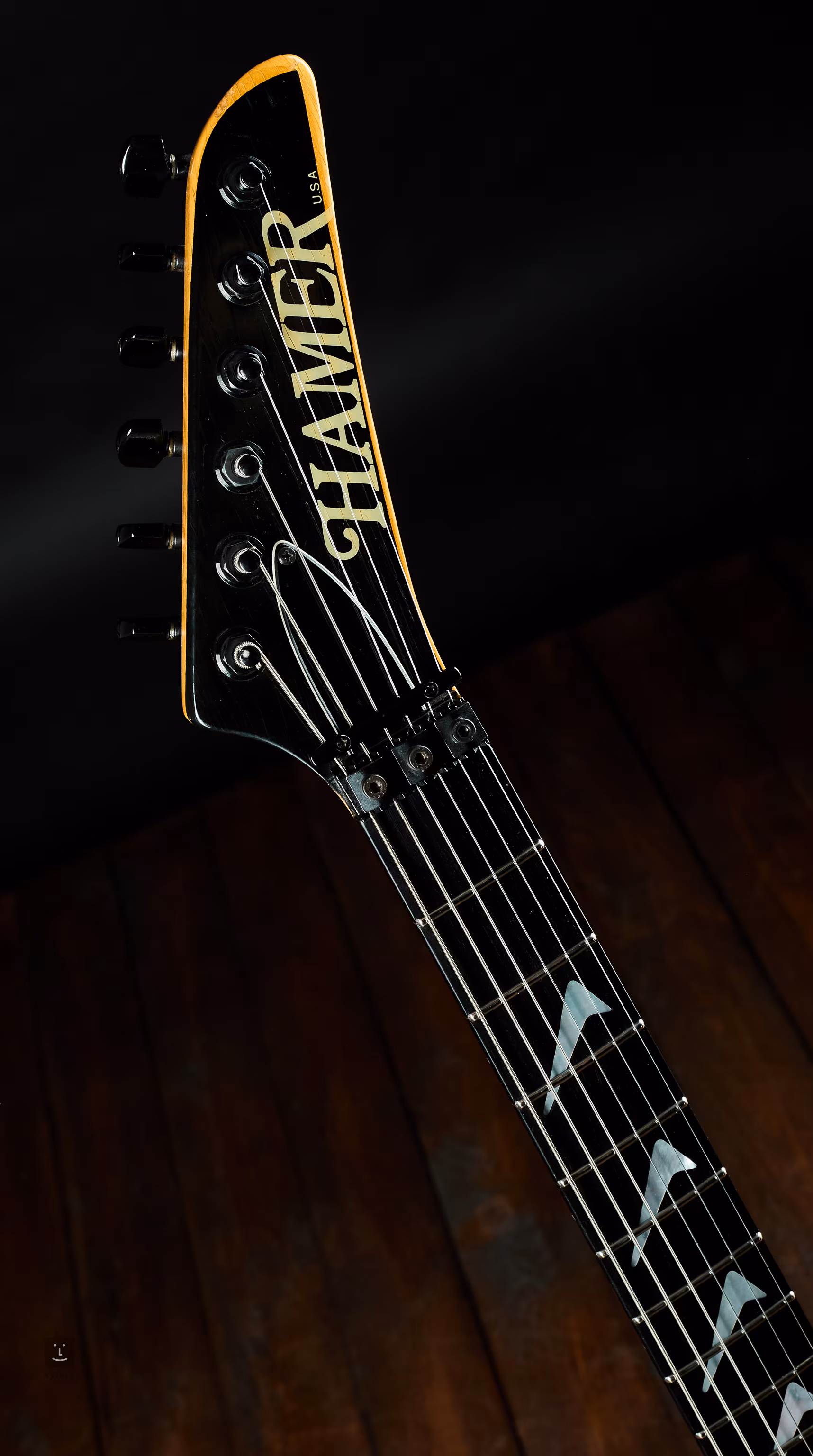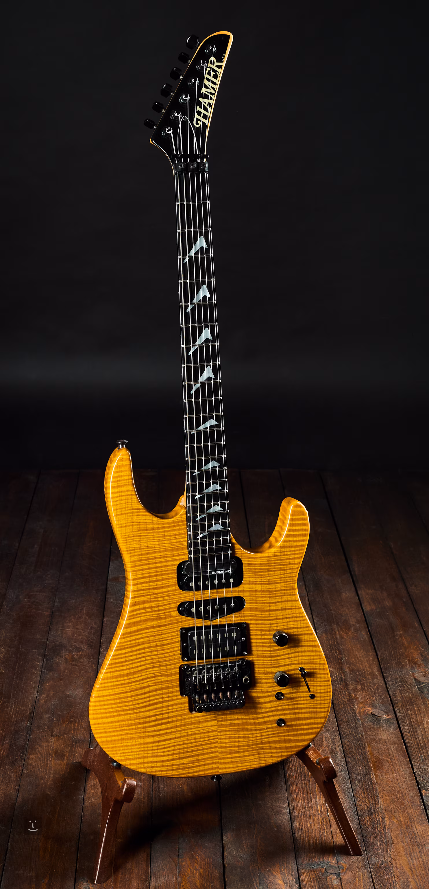 Superstrat od amerického Hameru, od legendární značky, která stála u zrodu této kategorie super-strat a navíc navíc ztělesňovala to, co opravdu znamená Custom-Shop: prvotřídní nástroje v zakázkové konfiguraci, kdy každý kus procházel ruční důkladnou výstupní kontrolou.