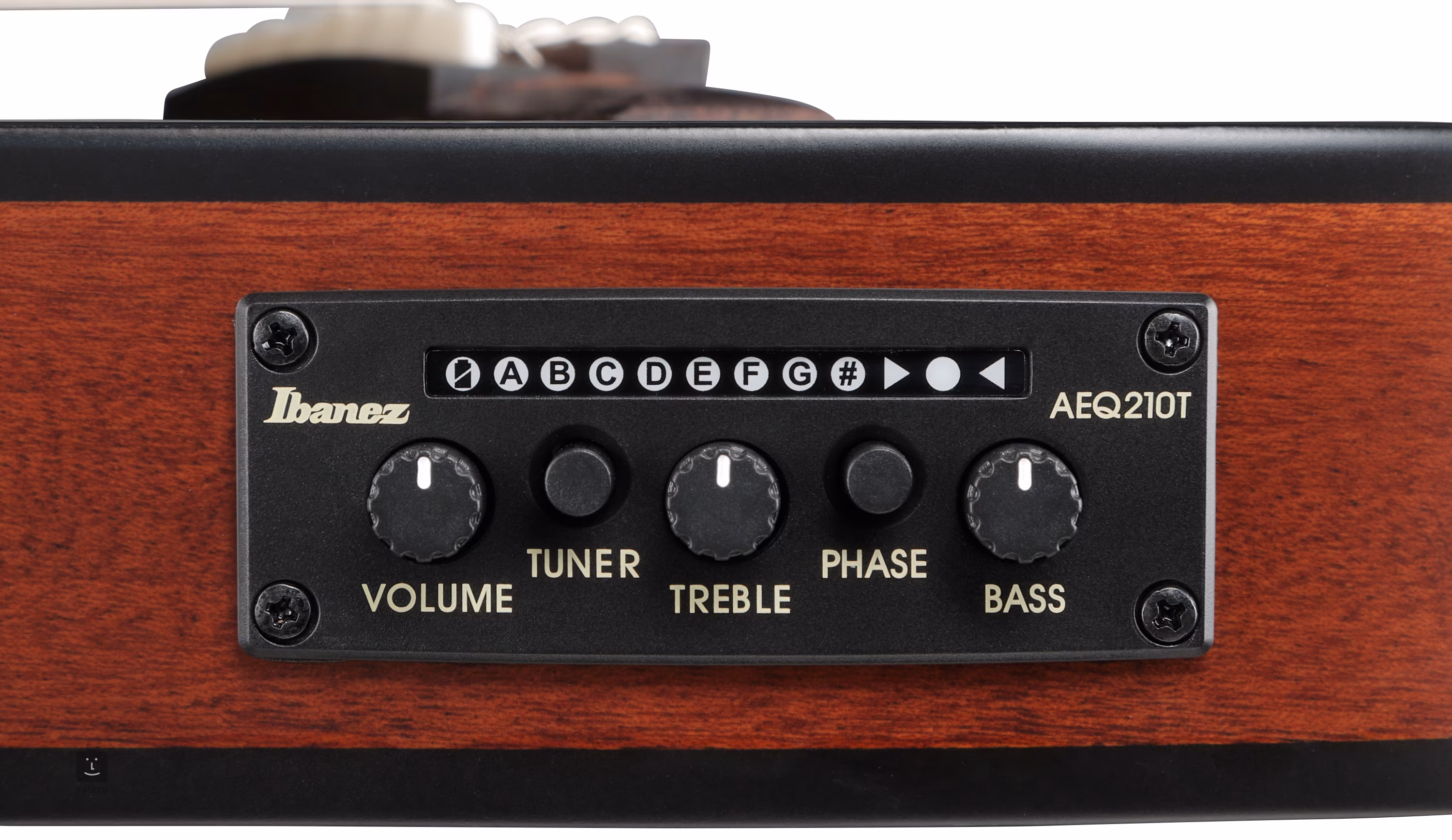 Možnost ozvučení nabízí podkobylkový piezo snímač Ibanez a firemní elektronika Ibanez AEQ210T s dvoupásmovým ekvalizérem, zabudovanou ladičkou a invertorem fáze v lubu kytary. Struny jsou ukotveny v ladicích mechanikách ve zlatém provedení s bílými kolíčky a palisandrové kobylce.