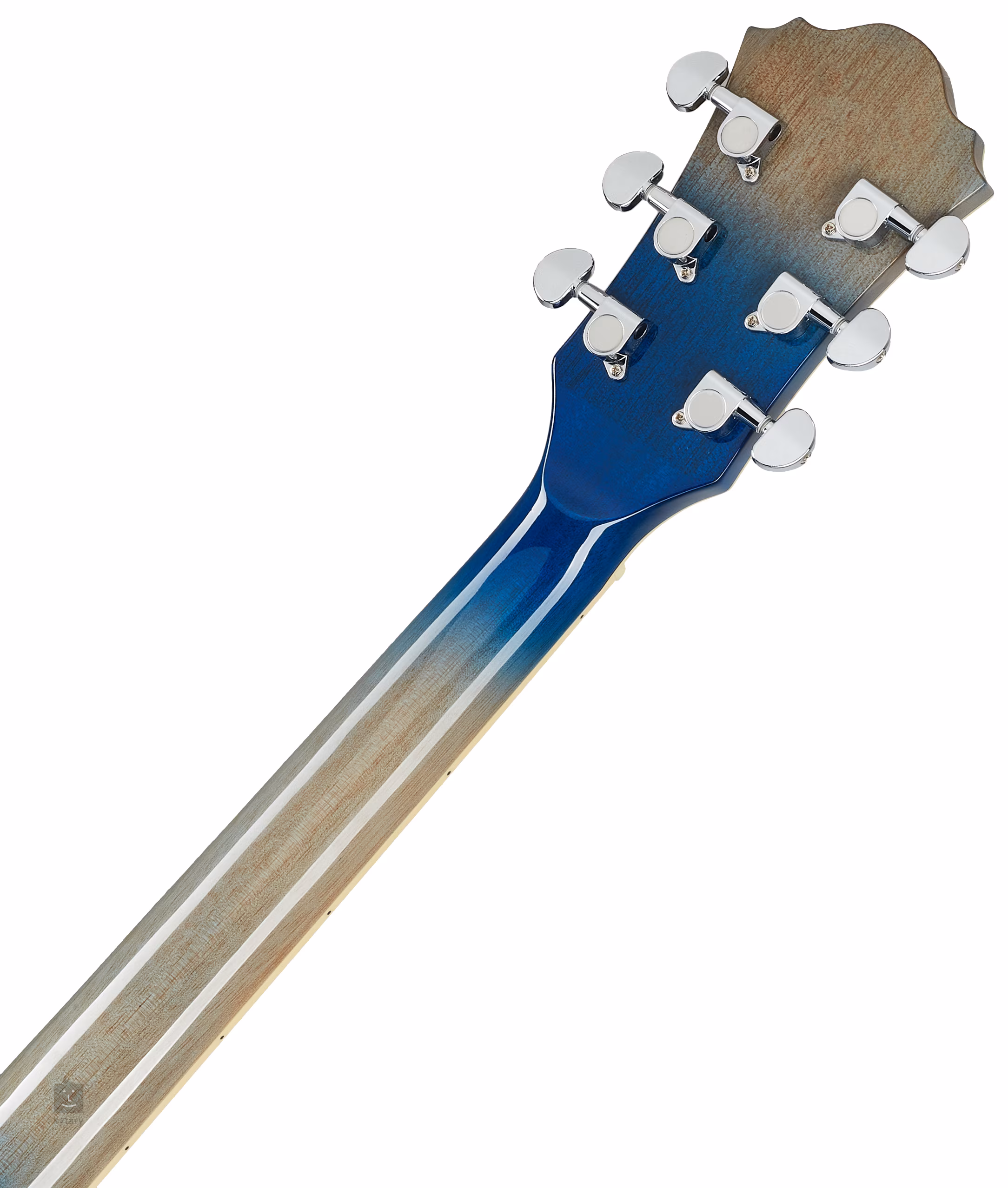 Struny jsou ukotveny ve firemních ladicích mechanikách a přes nastavitelnou palisandrovou kobylku ve struníku. Pěkné zpracování podtrhuje vícevrstvá lemovka těla, chromovaný hardware, černý pickguard a tradiční F otvory.