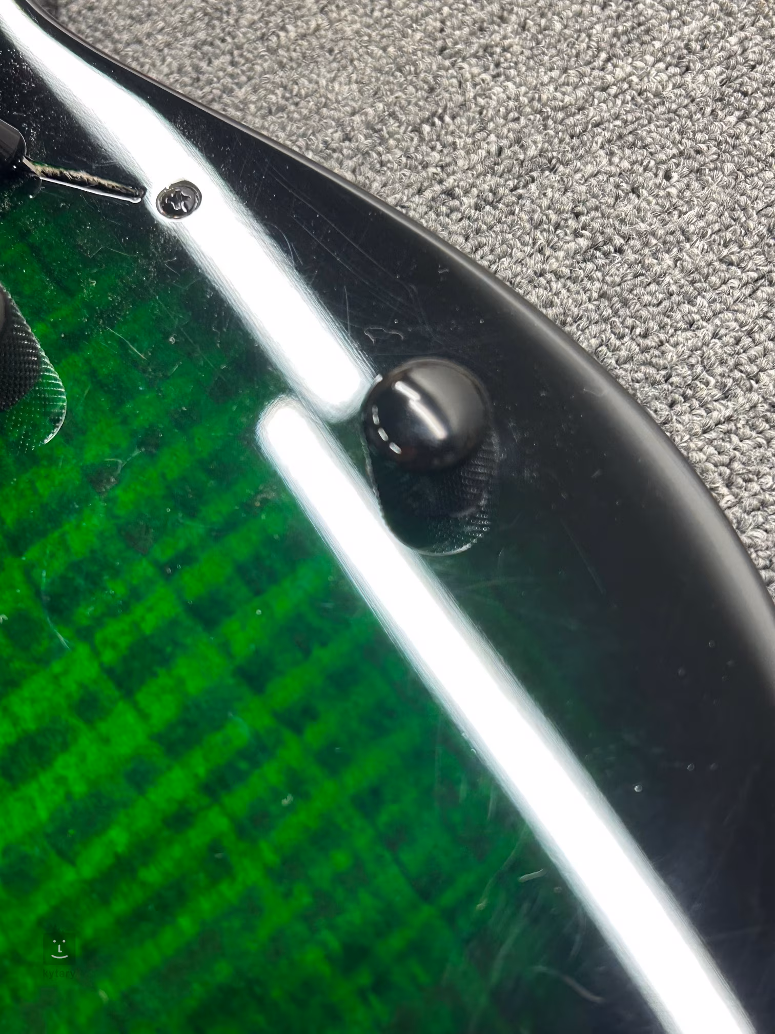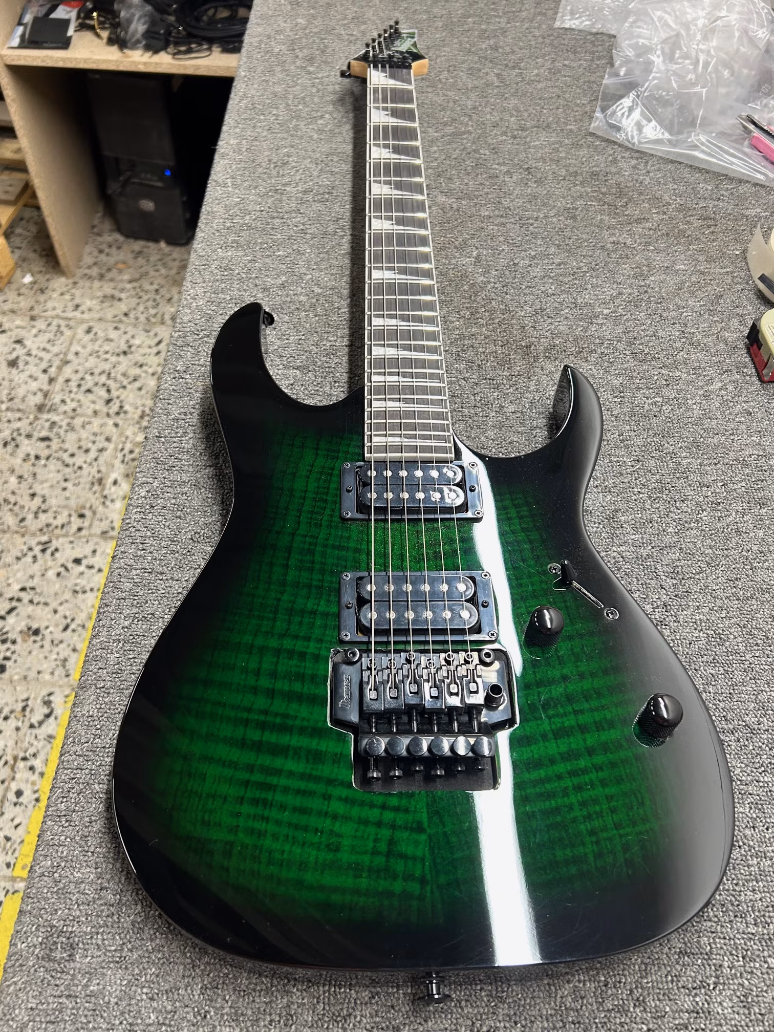 Elektrická kytara Ibanez GRG320FA-TEB je součástí řady GIO, která nabízí cenově dostupné nástroje vhodné pro začínající hráče. Jedná se o Super ST model RG s plošším krkem, nižší hmotností a výraznými výřezy těla šitý na míru začínajícím rockovým a metalovým kytaristům a kytaristkám. Topolové tělo kytary zdobí lipová dýha v dekoru fládrovaného javoru (Flamed Maple Art Grain Basswood top) a barevná úprava Transparent Emerald Burst. K javorovému krku je přilepen hmatník ze dřeva purpleheart/amaranth osazený čtyřiadvaceti pražci velikosti Medium. Orientaci na hmatníku usnadňují polohové značky v designu Sharktooth (žraločí zuby). Dva firemní humbuckery Infinity R s keramickými magnety poskytují kytaře potřebný zvukový drajv. S barvou a intenzitou zvuku lze pracovat pomocí potenciometrů hlasitosti, tónové clony a pětipolohového přepínače, který nabízí na pozicích 2 a 4 split-coil konfigurace snímačů, tj. single-coil charakter. Struny jsou ukotveny ve firemních ladicích mechanikách a dvojzvratném tremolu, kterým vyšperkujete hru působivými zvukovými efekty.