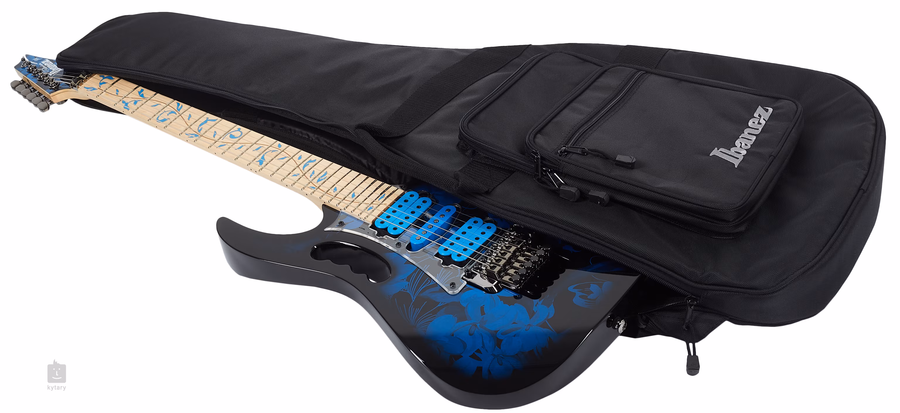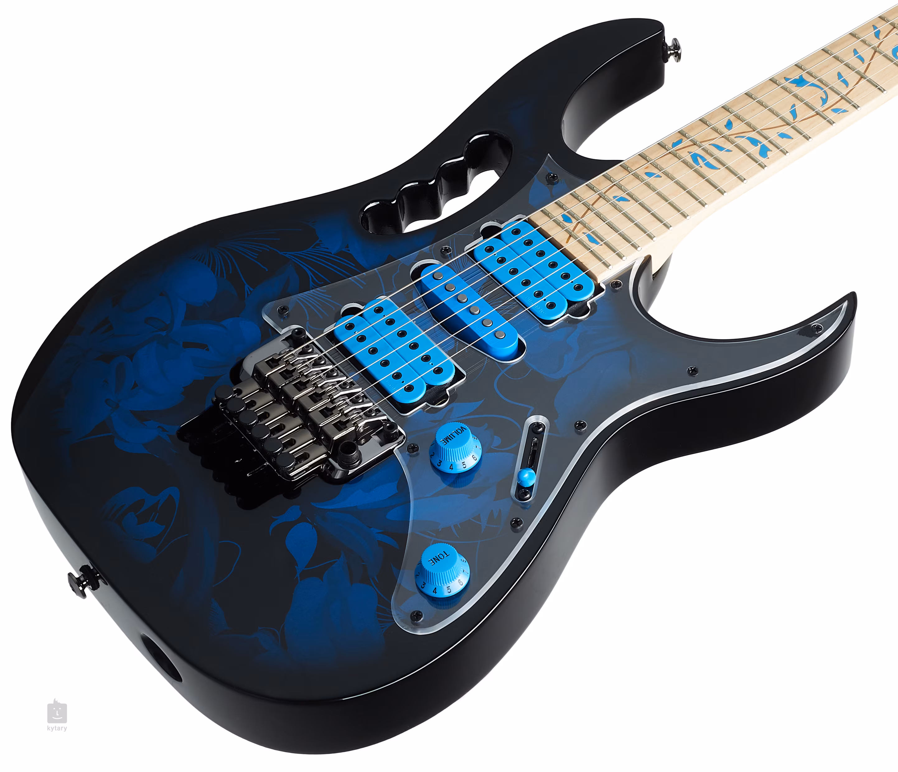 Elektrická kytara Steve Vai JEM77P Blue Floral Pattern japonské značky Ibanez je signature modelem známého kytarového kouzelníka. Disponuje poznávacími znaky v podobě výřezu v těle (monkey grip) a perleťové dekorace hmatníku Tree-of-Life, se kterými si okamžitě spojíte tuto osobnost.