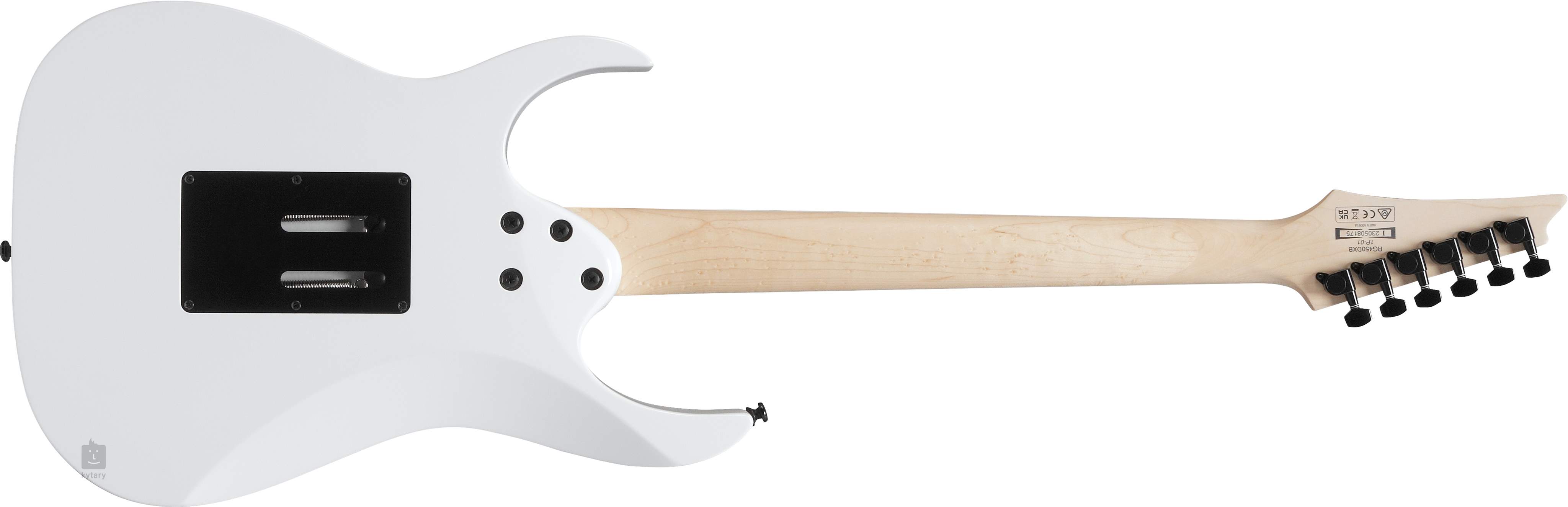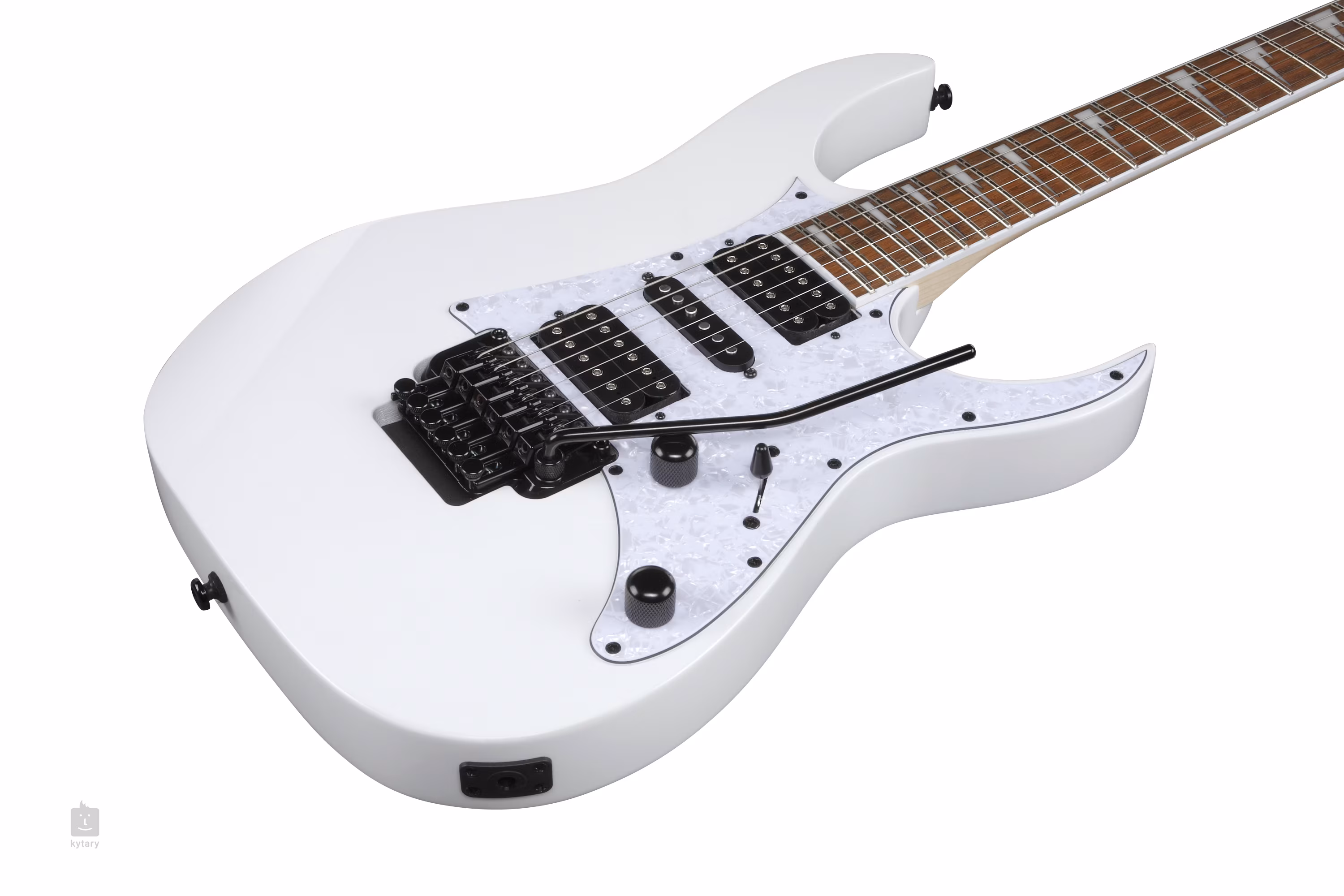 Tělo kytary RG450DXB White je zhotoveno z meranti. K rychlému javorovému krku s profilem Wizard III je přilepen hmatník z jatoby osazený čtyřiadvaceti pražci velikosti Jumbo. Orientaci na hmatníku usnadňují polohové značky v designu Sharktooth (žraločí zuby).