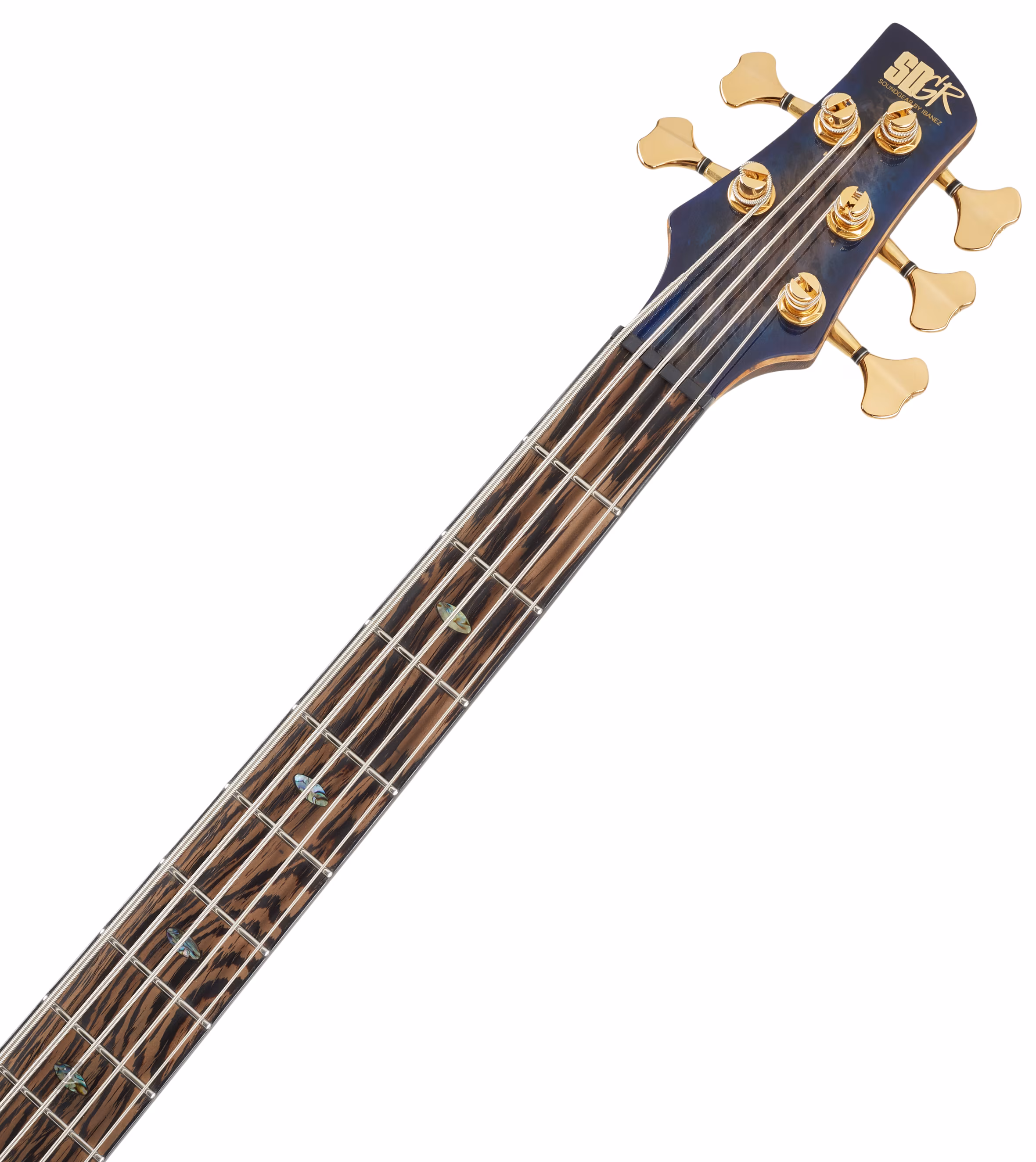 Mahagonové tělo pětistrunné baskytary SR2605 Cerulean Blue Burst z řady Premium zdobí top z kořenice topolu (poplar burl) s nepřehlédnutelnou kresbou. Úzký krk složený z patnácti kusů dřev panga panga, javoru, padouku, purpleheart a ořechu zpevňuje speciální titanová výztuž (KTS titanium rods). Hmatník ze dřeva panga panga je osazený čtyřiadvaceti pražci z nerezové oceli velikosti Medium. Konce pražců jsou zaoblené pro rychlejší hru a pohodlnější úchop krku (Premium Fret Edge Treatment). Orientaci na hmatníku usnadňují oválné perleťové polohové značky (abalone).
